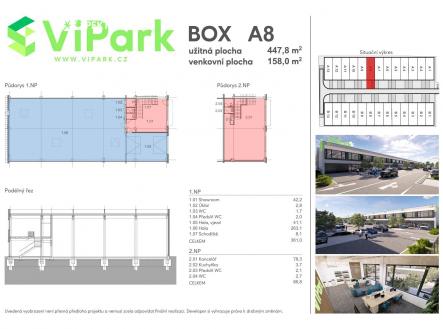 Nabízíme pronájem podnikatelských boxů v nově vzniklém komerčním areálu ViPark Brno. Ideální pro firmy hledající prostory pro obchod, skladování nebo drobnou výrobu. Strategické umístění nabízí rychlou dostupnost do centra a zároveň blízkost nájezdů na dálnice a rychlostní komunikace, MHD přímo před areálem. Bezproblémový příjezd kamionem samozřejmostí. Součástí je venkovní plocha pro parkování a manipulaci. Celá stavba je navržena jako energeticky velmi úsporná. rozměry jednotlivých boxů se drobně liší, příkladově uvádíme: užitná plocha boxu 447,8 m² (hala 304,2 m²; kancelář, showroom 120,5 m²; zázemí 23,1 m²) venkovní plocha 158 m² MOŽNOST SPOJENÍ VÍCE BOXŮ • MODERNÍ KOMERČNÍ NOVOSTAVBA splňuje nejnovější standardy a přináší inovativní pracovní prostředí pro podnikání • STRATEGICKÁ POLOHA vynikající dopravní dostupnost, ideální poloha s rychlým přístupem jak na dálniční spojení, tak do centra Brna, MHD přímo před areálem • FLEXIBILITA komerční prostory pro obchodní aktivity, skladování, distribuci i drobnou výrobu • VELMI ÚSPORNÁ STAVBA důraz na efektivitu a úspornost, což znamená nízké provozní náklady