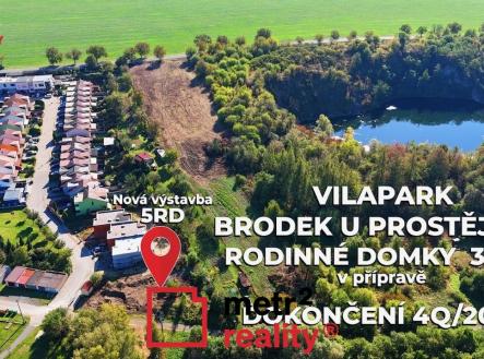 Hledáte moderní, technicky vyspělé, a především nízkonákladové bydlení v klidném prostředí blízko přírodě s vynikající dostupností do okolních měst? Pak pro vás máme novinku v Brodku u Prostějova. Objekt navrženého řadového domu „Novostavba 5 RD“ je součástí nově navržené řadové zástavby, která je řešena v návaznosti na nedávno budovanou lokalitu rodinných domů v jižní části městyse. Navrženy jsou řadové domy, dvoupodlažní, nepodsklepené. Jsou osazeny do svahu. Vstup je do 1. NP z přilehlé komunikace, vstup na terasu a do zahrady je z 2. NP balkonovými dveřmi. Objekty jsou v uliční čáře uskákány – plasticky členěny. Příchod a příjezd k řešeným RD je ze severozápadního směru z nově zpevněné komunikace, objekty rodinných domů jsou z této strany v rámci 2. NP předsazeny a venkovní plocha v úrovni 1. NP před objektem bude vydlážděná betonovou zámkovou dlažbou a bude sloužit pro parkování vozidel. Vydláždění bude provedeno investorem a bude navazovat na zpevněnou cestu. RD 2 je koncipován jako 3+kk. Vstup do objektu RD 2 je ze závětří krytého předsazeného 2. NP do chodby se zákoutím pro technické systémy domu a se schodištěm do 2. NP. Dále v rámci 1. NP ještě WC s umyvadlem. V druhém nadzemním podlaží navazuje schodiště na chodbu, ze které je vstup do ložnice, pokoje, do koupelny s vanou a s WC a do obytné místnosti – obývacího pokoje s kuchyňským koutem. Z tohoto prostoru je vstup na terasu. Část 2. NP, směrem do zahrady, je založena na zemině přímo v rámci 2. NP. Terasa je řešena ze zámkové dlažby do štěrkových vrstev. Základové konstrukce jsou řešeny jako základové desky tl. 400 mm z železobetonu s výztuží. Obvodové nosné zdivo, vnitřní nosné a nenosné zdivo je navrženo z Porothermu, z vnější strany zatepleného zateplovacím systémem s omítkou v barvě s šedými segmenty a barevnými pruhy dle pohledů. Stropní konstrukce železobetonové monolitické. Zastřešení stavby plochou střechou. Nášlapné vrstvy podlah uvnitř objektu z keramické dlažby a z vinylu. Výplně otvorů jsou řešeny plastové, zasklení trojsklo, vnitřní dveře v dřevěných obložkových zárubních. Jsou navrženy vnější žaluzie do podomítkových kastlů. VCM omítky, stropy z SDK desek pro možnost rozvodu rekuperace. Oplocení objektu pletivem na sloupky. Zastavěná plocha RD 2 82,40 m2, užitná plocha domu 87,45 m2, obytná plocha 51,20 m2, zpevněná plocha (vstup + vjezd i pod 2. NP, terasa za objektem) 54,70 m2. Celková půdorysná velikost domu RD 2 je 12,75 x 6,46 m. Vytápění domu bude řešeno podlahovým vytápěním rohožemi, v soc. zázemí ještě doplněno o topné žebříky. Zdrojem teplé vody pro vytápění a TUV je navrženo tepelné čerpadlo vzduch/voda umístěné v 1. NP, doplněné zásobníkem na 125 l. Venkovní jednotka bude umístěna na severu strany v zastíněném prostoru pod 2. NP. Jako zdroj budou na střeše nainstalovány fotovoltaické panely. Větrání řešeno decentrálními jednotkami s rekuperací. Osvětlení LED zdroji. Standard domu je nastaven formou finančních budgetů. Nesmírnou přidanou hodnotou této nabídky je aktivní spolupráce s provádějící stavební firmou, pro kterou není problém cokoliv, je-li to v souladu s projektovou dokumentací, stavebním povolením a nebrání kolaudaci domu. PENB třídy B. Městys Brodek u Prostějova nabízí vše potřebné pro rodinný život. Je zde základní škola, mateřská školka, obchody, restaurace, lékař, za pár minut se dostanete na dálnici a pak lehce do Prostějova, Olomouce nebo do Brna. Bližší informace o projektu, podmínek rezervace, systému financování apod. vám poskytne RK.