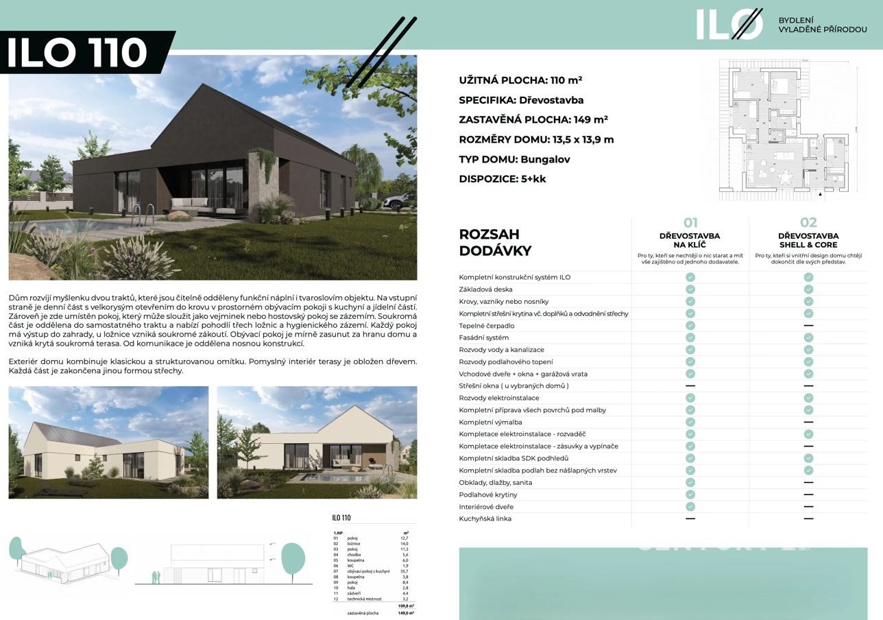 Ve spolupráci s majitelem pozemku nabízíme kompletní výstavbu moderní dřevostavby RD o dispozici 5+kk v klidné okrajové části obce Hlinsko pod Hostýnem. Dům o užitné ploše 110 m² bude postaven na pozemku o rozloze cca 1200 m², který přináší dostatek soukromí a prostoru pro relaxaci plus pozemek cca 400 m2 pro zahrádkáření. Životní prostor domu je optimálně rozvržen pro komfortní rodinný život, kde každý člen rodiny nalezne své místo. Nabídková cena zahrnuje: pozemkovou parcelu pro RD o výměře cca 1200 m2 a sousední zahradu cca 400 m2 vhodnou pro sad, kompletní výstavbu RD napojenou na IS se základní terénní úpravou, kompletní vnitřní vybavení sanitárními předměty, podlahové krytiny, dveře, obklady a dlažby, tepelné čerpadlo s podlahovým rozvodem vytápění, projekt a vyřízení stavebního povolení. Kuchyňská linka není součástí dodávky Stavba kombinuje moderní technologické prvky s ekologickým přístupem a respektuje moderní trend minimalismu, nicméně nepřehlíží ani funkčnost každodenního života. Jak je zvykem u novostaveb, dům disponuje pouze nejnutnějšími technickými prvky bez zbytečného přetváření. Využijte nabídku výstavby moderního energeticky úsporného bydlení v klidné oblasti s výhledem na Hostýnské vrchy.