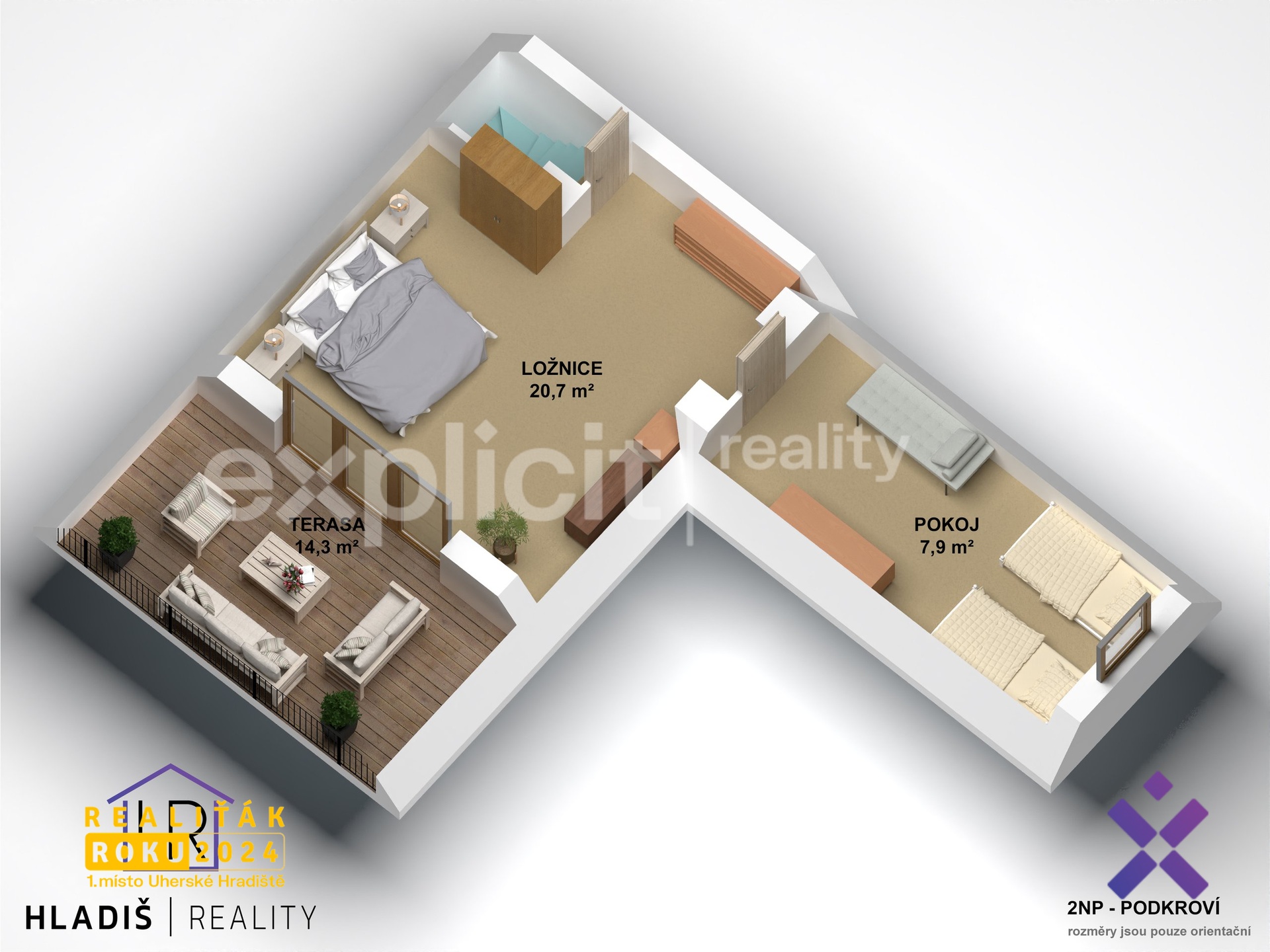 Toužíte po chalupě na klidném místě, odkud budete mít výhledy na Bílé Karpaty a za rohem les, cyklotrasy nebo lyžařskou sjezdovku? Pak pro vás mám chalupu, která si zaslouží vaši pozornost. Dispozice 3+kk pod Mikulčiným vrchem, která kombinuje klid venkova s pohodlím domu, který může sloužit i k trvalému bydlení. - dispozice 3+kk, celková plocha 116 m², užitná plocha 71 m², plocha pozemku 593 m² - 3 terasy o celkové ploše 38 m² - jedna u vstupu, druhá v obýváku a třetí u ložnice, kamenný sklep 7 m² - parkování na pozemku nebo u pozemku - rok výstavby 1995, zateplení 5 cm polystyren (2005) - střecha sedlová, hliníkové šablony, komín zděný, se šamotovými trubkami - podlahy beton, dřevo, dlažba, plastová okna a dřevěná dvojskla - kuchyň původní s vestavěnými spotřebiči, koupelna/WC původní, funkční - topení AKU kamna, krb, přímotopy (nové rozvody 2000) - voda ze studny pod pozemkem, vlastní studna i na pozemku (nutno revitalizovat nebo provést vrt), pitná voda donášená, ohřev vody průtokový ohřívač - náklady na provoz: elektřina: cca 4 000 - 5 000 Kč/rok při rekreačním využití - zahrada s terasou a možností posezení, grilování a spoustu aktivit - úžasná, klidná lokalita s krásnými výhledy na okolí - v blízkosti turistické stezky, cyklotrasy, Lopeník - zkrátka je to v srdci Bílých Karpat Chalupa se nachází pod Mikulčiným vrchem, pod chatou Troják, ve velmi klidné části s krásnými výhledy, orientací na jihovýchod a jihozápad. Přístup je po zpevněné cestě, poslední úsek tvoří polní cesta, ale je sjízdná. V blízkosti najdete rozhlednu, sjezdovku i cyklotrasy - v budoucnu možná i bikepark, který zde aktuálně zvažují vybudovat. Takže o turistický ruch zde bude postaráno. Vizualizace a vyobrazení nemovitosti a pozemku jsou pouze ilustrativní. Závazné údaje o hranicích pozemku jsou uvedeny v katastrální mapě. Líbí se Vám tato nemovitost? Potkejme se osobně na místě, co Vy na to? Zavolejte mi nebo napište a já Vám sdělím veškeré detaily do poslední cihly. Chtěli byste, abych i Vás zastupoval při prodeji? Stačí mi napsat, jsem tu pro Vás kdekoli a kdykoli. Těším se na Vás :) Hladiš - Reality
