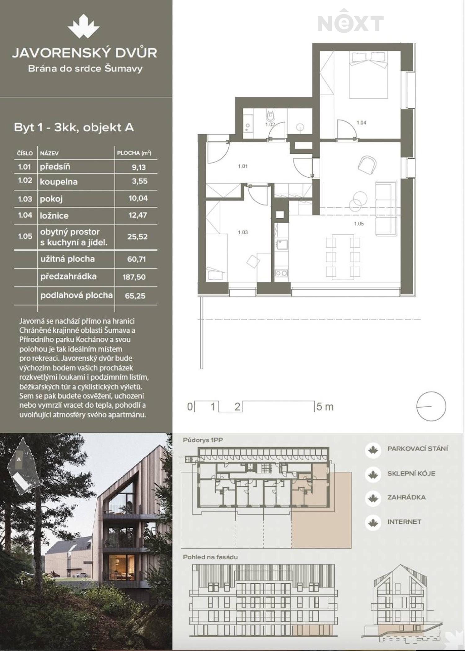 Chcete uniknout ruchu všedních dní a nadechnout se čerstvého šumavského vzduchu? Představte si vlastní apartmán v horách – místo, kde se potkává klid, příroda a moderní komfort. V obci Javorná (část obce Čachrov, okres Klatovy) vzniká nový projekt dvou moderních budov na hranici CHKO Šumava a Přírodního parku Kochánov. Lokalita, která má energii po celý rok. Léto patří turistice, cyklistice, koloběžkám i nordic walkingu. Zima? Nazujete běžky přímo u domu, vezmete sáňky nebo vyrazíte do nedalekého skiareálu Javorná. Čtyři roční období, čtyři důvody, proč tu být. Nabízíme apartmán o dispozici 3+kk a celkové ploše 65 m². K apartmánu náleží terasa a soukromá zahrada o velikosti 246m² s krásným výhledem do okolní přírody. Standard projektu je vysoký a promyšlený do detailu: – teplovodní podlahové vytápění s možností ovládání online – vytápění pomocí tepelných čerpadel – fotovoltaika na střeše – hliníková okna s izolačním trojsklem – dřevěná fasáda s úpravou termowood – výtah – sauna s odpočinkovou místností v suterénu (rezervační systém) Každý apartmán má vlastní elektroměr, vodoměr i měřič tepla. Dokončení projektu je plánováno na červenec 2027. Tato nemovitost není jen místem pro odpočinek. Díky atraktivní lokalitě a celoročnímu využití jde také o velmi zajímavou investiční příležitost. Možnost financování hypotékou je samozřejmostí. Nabízíme také moderní formu financování až na 30 let bez ohledu na věk či prokazování příjmů. Rádi Vám představíme celý projekt osobně a vysvětlíme všechny detaily. Pro komunikaci uvádějte evidenční číslo zakázky N110245.