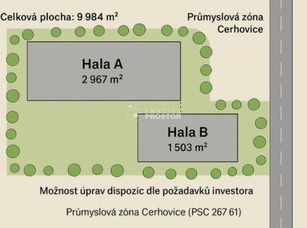 Nabízíme k prodeji komerční pozemek o výměře 9 984 m² v průmyslové zóně Cerhovice, s přímým napojením na komunikaci II/605 a pouhých cca 400 m od sjezdu D5 (exit 41). Pozemek je dle územního plánu určen pro plochy výroby a skladování (VK). Vhodný je zejména pro výrobní firmu hledající vlastní areál, regionální distribuční centrum nebo lehkou průmyslovou výrobu bez nadlimitního hluku.Zastavitelnost činí až 70 % plochy, což umožňuje realizaci výrobního či skladového areálu o velikosti cca 4 000 m². V rámci předchozího návrhu byly řešeny dvě haly o velikosti 2 967 m² a 1 503 m², přičemž dispozici lze upravit dle potřeb investora. Navržená světlá výška je do 9 m a areál je vhodný pro provoz s kapacitou cca 30–120 zaměstnanců. Projektová dokumentace k předchozímu záměru je k dispozici jako podklad pro nové povolení.Lokalita nabízí výbornou dopravní dostupnost – 400 m od dálnice D5 (Praha – Plzeň – Rozvadov), Praha cca 54 km, Plzeň cca 45 km, s přímým napojením na hlavní komunikaci.Pozemek je vhodný pro firmu, která chce vybudovat vlastní sídlo s výrobou a skladovým zázemím v dostupnosti dálnice D5.Pro více informací, územně-plánovací regulativy a podklady k původnímu projektu nás kontaktujte.