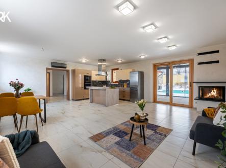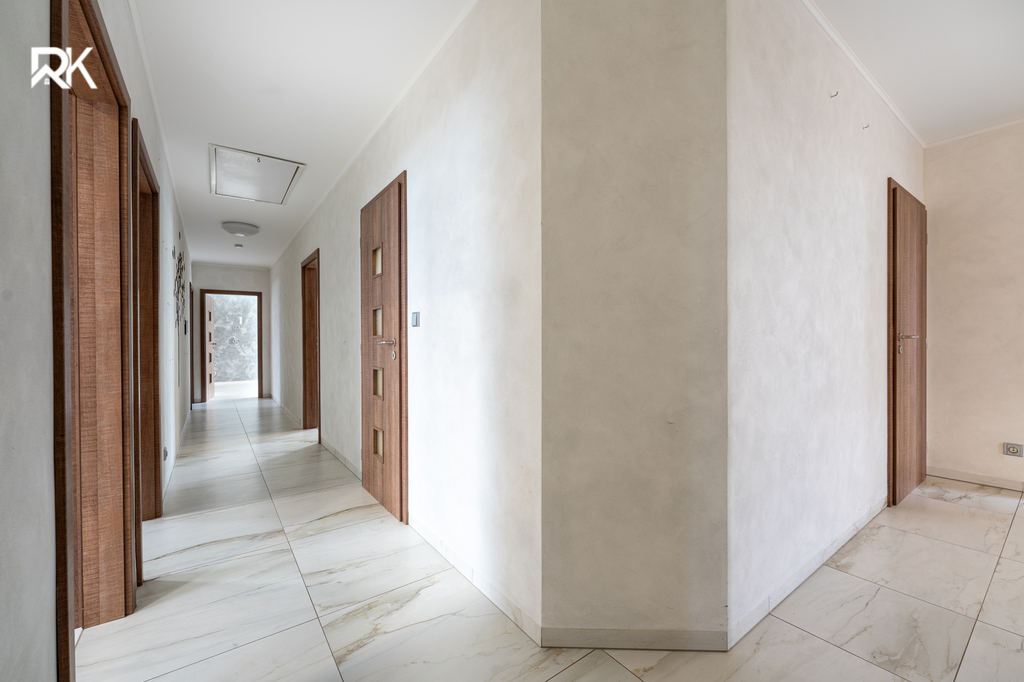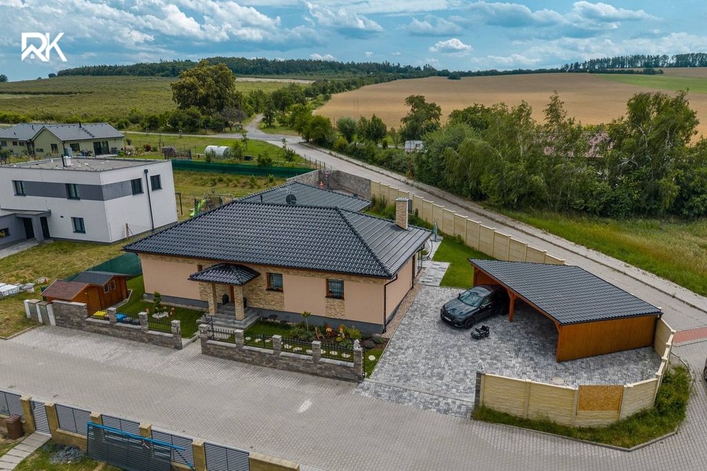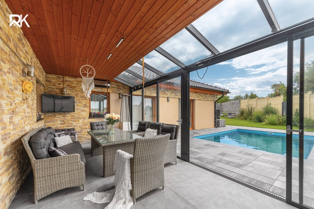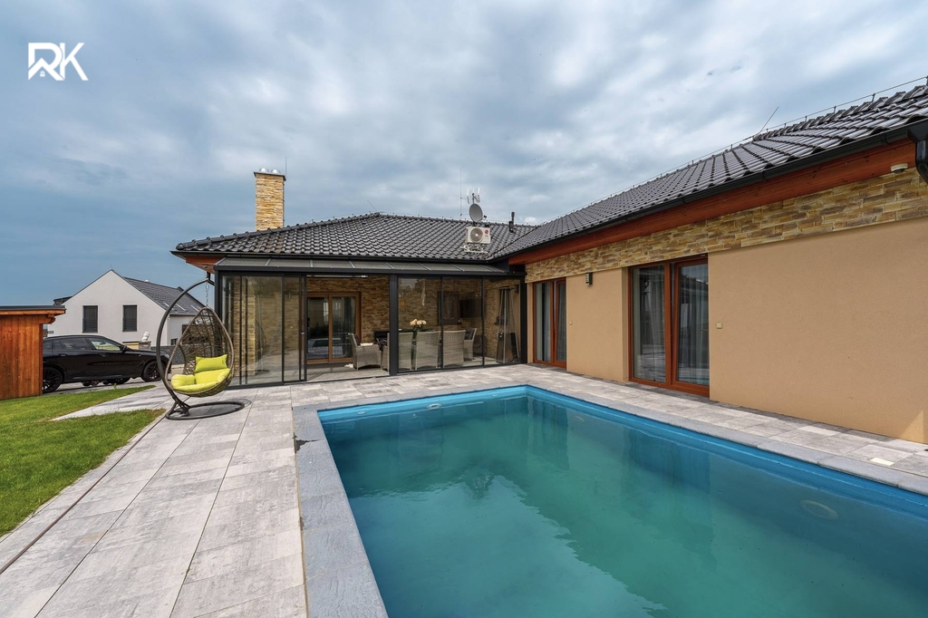 V Červených Pečkách, jen několik minut jízdy od Kolína, nabízíme k prodeji výjimečný moderní bungalov o užitné ploše 229 m² s celoroční zimní zahradou o velikosti 26 m², kolaudovaný v květnu 2022. Nemovitost se nachází v klidné části obce s kompletní občanskou vybaveností a zároveň nabízí naprosté soukromí. Dům je dispozičně řešen jako velkorysé 5+kk. Dominantou je prostorný obývací pokoj propojený s kuchyní a jídelnou, jehož atmosféru doplňují krbová kamna. Z obytného prostoru je přímý vstup do zimní zahrady, která je vytápěná i klimatizovaná a umožňuje plnohodnotné využití po celý rok. Soukromou část domu tvoří čtyři samostatné ložnice, přičemž každá disponuje vlastní šatnou. K dispozici jsou dvě koupelny, tři samostatné toalety, praktická spíž u kuchyně a další samostatná šatna u vstupu do domu. Další úložný prostor nabízí skladovací místnost v podkroví o velikosti cca 35 m². Stavba byla realizována z kvalitních materiálů s důrazem na energetickou úspornost a dlouhou životnost. Použito bylo zdivo Heluz Family, fasáda je zateplena 20 cm izolace, strop disponuje 50 cm minerální vaty. Osazena jsou sedmikomorová okna s trojskly a dům je zastřešen pálenou glazovanou taškou. V interiéru byly použity luxusní italské dlažby a kvalitní vinylové podlahy. Samozřejmostí jsou bezpečnostní rolety s motory Somfy ve všech oknech. Komfort bydlení zajišťuje kompletní podlahové vytápění napojené na kondenzační plynový kotel v kombinaci s tepelným čerpadlem. Každá místnost je vybavena klimatizací. Nemovitost disponuje kamerovým a zabezpečovacím systémem včetně videozvonku. Exteriér domu je navržen s důrazem na pohodlí i reprezentativní využití. K dispozici je kryté parkování pro tři vozy, elektrická vjezdová brána a 400V zásuvka vhodná například pro wallbox či dílenské využití. Na zahradě se nachází nadstandardní bazén s protiproudem, vyhřívaný samostatným tepelným čerpadlem. Zahrada je kompletně zatravněná, vybavena automatickou závlahou a retenční nádrží na dešťovou vodu. Připravena je také infrastruktura pro venkovní kuchyni včetně přívodu vody, odpadu a WC. Součástí jsou dvě zahradní kůlny pro technické zázemí. Červené Pečky nabízejí plnou občanskou vybavenost – mateřskou i základní školu, zdravotní středisko, lékárnu, poštu, obchody, restaurace, sportoviště i vlakové spojení. Díky blízkosti Kolína nebo Kutné Hory je zajištěna široká nabídka pracovních příležitostí i kompletní infrastruktura většího města, přičemž Praha je dostupná přibližně do 45 minut. Nemovitost lze financovat hypotečním úvěrem, který Vám rádi vyřídíme, pros více informací kontaktujte makléře.