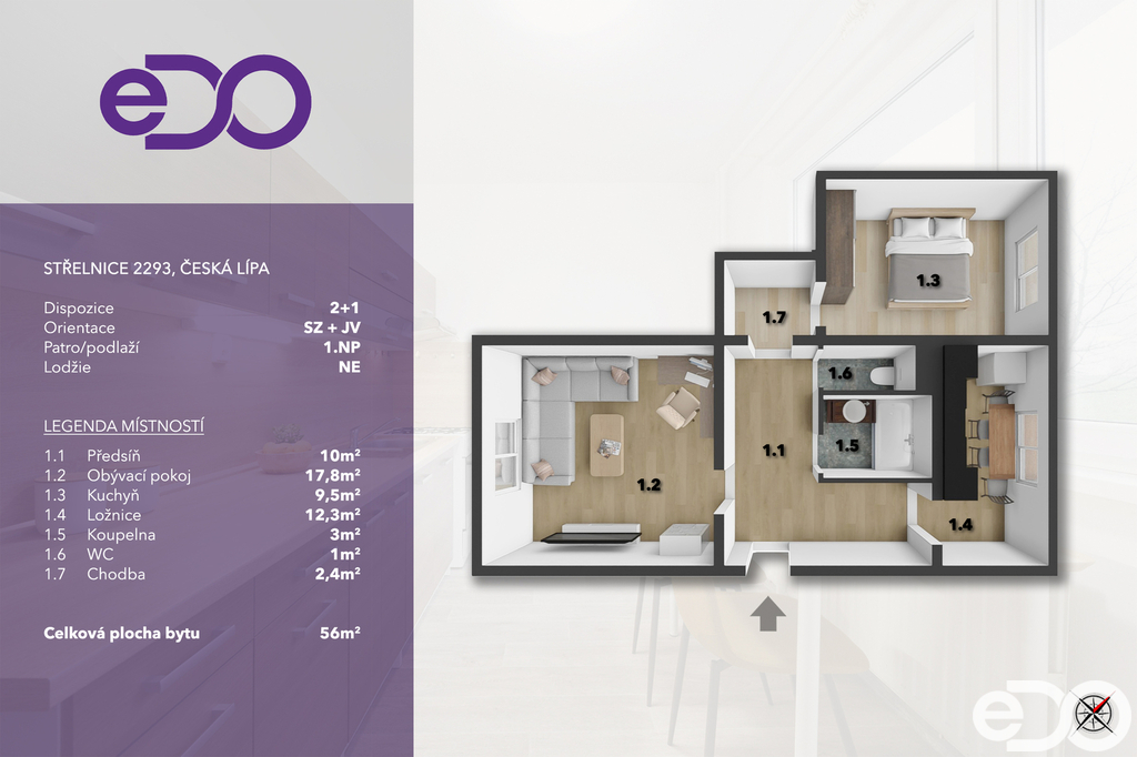 Nabízíme k prodeji byt o dispozici 2+1 a celkové výměře 56 m², který se nachází na adrese Střelnice 2293, Česká Lípa. Byt je prakticky řešený, s dostatkem denního světla a nabízí ideální dispozici jak pro vlastní bydlení, tak jako investiční příležitost k pronájmu. Jednotka se skládá z obývacího pokoje, samostatné ložnice, kuchyně, koupelny a samostatného WC. K bytu náleží také sklepní kóje. Dům se nachází v žádané a klidné lokalitě s kompletní občanskou vybaveností v docházkové vzdálenosti – školy, školky, obchody, lékaři, sportoviště i zastávky MHD a rozlehlý Městský park. Parkování je možné v okolí domu. Byt je vhodný pro klienty, kteří hledají dostupné bydlení, ale i pro investory, kteří ocení stabilní poptávku po nájemním bydlení v této lokalitě. V případě zájmu o více informací nebo sjednání prohlídky mě neváhejte kontaktovat.