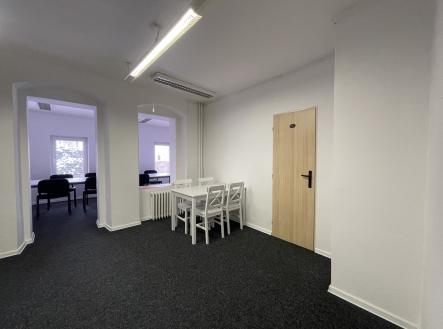 Nabízíme pronájem komerčních prostor o výměře 75m2 v 1.NP řadového domu v Jiráskově ulici. Jedná se o čtyři průchozí místnosti disponující kuchyňským koutem, třemi přepaženými zasedacími kouty, samostatným WC a sprchovým koutem, který lze předělat na druhé samostatné WC. Prostory disponují výlohou, možnost umístění reklamy, elektrická přípojka s regulací dle vnějšího osvětlení k dispozici. Vybaveno zabezpečovacím systémem. Měsíční nájem činí 12.000 Kč + 3.000 Kč zálohy na vytápění, vodu a elektřinu, provize realitní kanceláři je 12.000 Kč + DPH. Prostory jsou vhodné k provozování obchodu, provozování různých služeb, jako kancelářské prostory nebo showroom. Dobrá lokalita v blízkosti náměstí vřele doporučuji. K dispozici jsou i kanceláře v 1. patře o výměře 35m2. Jedná se o dvě průchozí místnosti disponující kuchyňským koutem. WC na patře je společné. Měsíční nájem u těchto prostor činí 4.000 Kč.