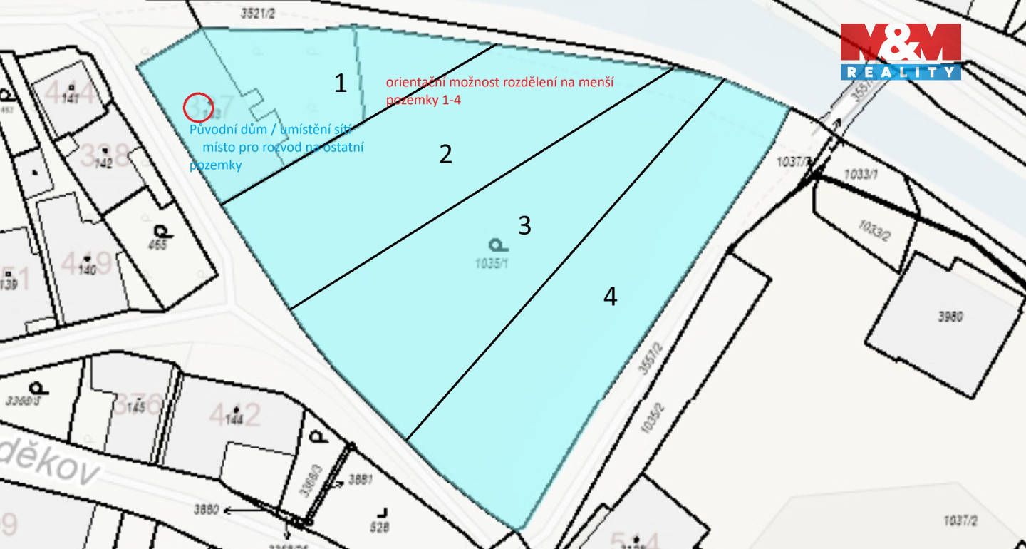 Předmětem prodeje je pozemek o výměře 3 534 m² (druh: zahrada) a navazující stavební parcela č. 143 (596 m²), na které stojí starší dům č.p. 337 – celková výměra činí 4 130 m². V případě zájmu o menší část například k výstavbě RD lze pozemek o výměře 3 534 m² rozdělit po dohodě na 3 menší o orientační velikosti cca 1200 m². Pozemek se nachází v území s funkčním využitím SM – smíšená obytná městská zóna, které umožňuje: Výstavbu rodinných a menších bytových domů. Provozování služeb, ordinací, kanceláří. Kombinaci bydlení s nevýrobním podnikáním. Dům č.p. 337 je napojen na vodu a elektřinu. Je možné ho rekonstruovat, přestavět či nahradit novostavbou. Sítě: elektřina, voda na pozemku, kanalizace a plyn jsou v přilehlé komunikaci. Přístup zajištěn taktéž z veřejné komunikace. Územní limity: max. 50 % zastavitelnost, 2 NP- 4 NP, min. 30–40 % zeleně. Cena je k jednání.