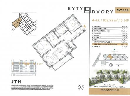 BYTY 4 DVORY – NOVÝ ZAČÁTEK VAŠEHO PŘÍBĚHU v sousedství Vrbenských rybníků. Představujeme projekt rezidenčního bydlení v Českých Budějovicích BYTY 4 DVORY. Moderní architektura, promyšlené dispozice a rozmanitá nabídka bytových jednotek. Pokud hledáte rodinné bydlení, investiční nebo startovací byt bude pro vás adresa BYTY 4 DVORY tím pravým místem. Projekt nabízí celkem 211 bytů ve dvou bytových domech. Hlavním objektem je dům A, který je rozdělen na pět sekcí a v šesti podlažích najdete 196 bytů dispozic 1+kk – 4+kk. Menším domem je objekt B a jeho součástí je 15 bytových jednotek velikosti 2+kk – 3+kk. Když mluvíme o moderním bydlení je samozřejmostí, že ke každému bytu náleží balkon nebo terasa. Působivé je propojení teras s venkovním prostorem u bytů ve 2. a 6. podlaží bytového domu A. Zaměřte se na zdánlivě ustupujícímu navržení jednotlivých sekcí, které vytváří unikátní prostory. Parkování a sklepní kóje ke každému bytu se nachází v suterénu bytových domů. Nabízený byt v této inzerci je dispozice 4 + kk o výměře 102,99 m2 a jeho příslušenstvím je balkon 9,35 m2. Byt č. 2.5.8 se nachází v 5. NP šestipodlažního bytového domu s výtahem BYTY 4 DVORY, sekce 2. Předpokládaný termín dokončení stavby je prosinec 2025. Dispoziční řešení bytu: ze vstupní chodby (15,02 m2), která svou velikostí umožňuje umístnění vestavěných skříní je přístupná velká koupelna (8,68 m2), která je vybavena vanou, sprchovým koutem, umyvadlem, toaletou a přípojkou pro pračku. Naproti koupelně se nachází samostatná WC místnost s toaletou a umyvadlem. Chodba je komunikačním prostorem celého bytu a zajišťuje přístup do ložnice 1 (13,68 m2) a pokoje (10,61 m2). Z chodby je dále vstup do obytného prostoru (30,63 m2) s kuchyňským koutem. Ložnice 2 (15,87 m2) je přístupná z obytného prostoru. Obytný prostor je prosvětlen velkou okenní sestavou a je z něho přímý vstup na balkon (9,35 m2). Obytný prostor je orientovaný na jih a ložnice i pokoj jsou orientovány na severozápad. Standardní vybavení bytu: kvalitní zařizovací předměty koupelny (sprchový kout, umyvadlo, toaleta, přípojka pro pračku), obklady, dlažby, vnitřní dveře a podlahové krytiny. Stavební a technické řešení nízkoenergetického bytového domu zaručuje úsporou nákladů. K bytu lze dokoupit sklepní kóji, vnitřní nebo venkovní parkovací stání. Lokalita pro výstavbu projektu BYTY 4 DVORY se rozkládá západní straně Českých Budějovic v těsném sousedství přírodní rezervace Vrbenské rybníky. V bezprostřední blízkosti se nachází volnočasový park 4 Dvory, supermarket Kaufland. Lokalita je velmi dobře dostupná MHD i automobilem. Zastávky MHD se nachází v blízkosti bytových domů. Občanská vybavenost v docházkové vzdálenosti: ZŠ E. Destinové, O. Nedbala, MŠ E. Destinové, Větrná, lékaři, pošta, restaurace, multikino. Dopravní dostupnost: MHD linky č. 5, 8, autem 5 minut z centra.