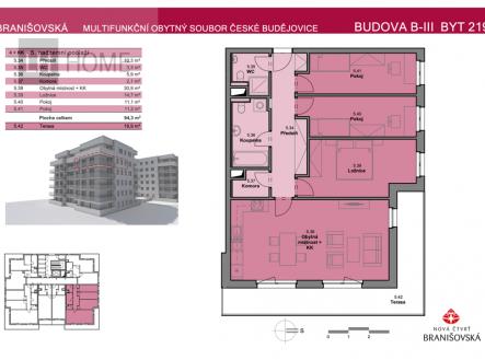 Druhá etapa projektu Nová čtvrť Branišovská B-I-II-III právě v prodeji! Představujeme vám jedinečnou příležitost bydlení, která kombinuje atraktivní lokalitu, moderní design a komfortní vybavení! Tento stylový byt 4+kk (94,3 m2) s prostornou terasou (19,9 m²) čeká na svého nového majitele v 5. patře novostavby bytového domu B-III. Byt je navržen s důrazem na moderní styl a maximální funkčnost – perfektní volba pro jednotlivce, mladé páry nebo jako investiční příležitost. Součástí ceny je kvalitní standardní vybavení, které splní očekávání i náročnějšího zákazníka. Komfort, styl a dostupnost na jednom místě. Projekt nabízí celkem 225 bezbariérových bytů různých dispozic (od 1+kk po 4+kk). Všechny byty se pyšní balkónem, lodžií nebo terasou. K dispozici je i možnost zakoupení garážového parkovacího stání (od 390 000 Kč) nebo sklepa, který vám poskytne úložný prostor navíc. Harmonogram kolaudace a flexibilní financování: Kolaudace bytového domu je plánována na 4. čtvrtletí roku 2028. A co víc – nabízíme možnost družstevního bydlení, což je skvělá volba pro ty, kteří hledají flexibilní financování a snadnější cestu k vlastnímu bydlení. Neváhejte a kontaktujte nás ještě dnes! Rádi vám poskytneme více informací, poradíme s financováním nebo domluvíme osobní prohlídku. Nová čtvrť Branišovská – to je místo, kde se sny o bydlení stávají skutečností!