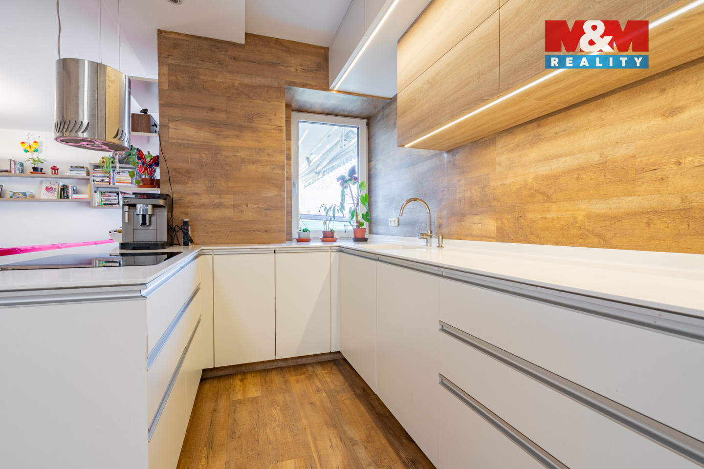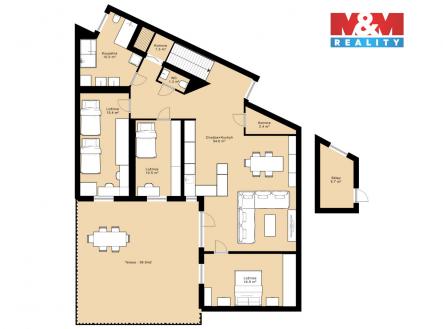 Nabízíme k prodeji prostorný a prakticky řešený byt s velkorysou terasou o výměře 36,6 m², která poskytuje ideální prostor pro odpočinek i rodinné posezení. Součástí je také sklep v mezipatře o rozloze 5,7 m² a vlastní parkovací místo v krytých garážích, přičemž je možné za minimální roční poplatek pronajmout i druhé garážové stání. Většina vybavení v bytě zůstane k dispozici novým majitelům. Dispozice bytu je promyšlená tak, aby zajistila maximální komfort všem členům domácnosti. Hlavní ložnice se nachází v samostatné klidové části bytu, zatímco dětské pokoje jsou situovány na opačné straně, což poskytuje dostatek soukromí i nerušeného prostoru. Dominantou bytu je světlý obývací pokoj propojený s kuchyní a jídelnou, odkud je přímý vstup na terasu. K dispozici je také prostorná koupelna s WC, samostatné WC a dvě komory nabízející praktické úložné zázemí. Byt se nachází na okraji města v těsné blízkosti lesa a je ideální volbou pro rodinu, která hledá komfort a soukromí.