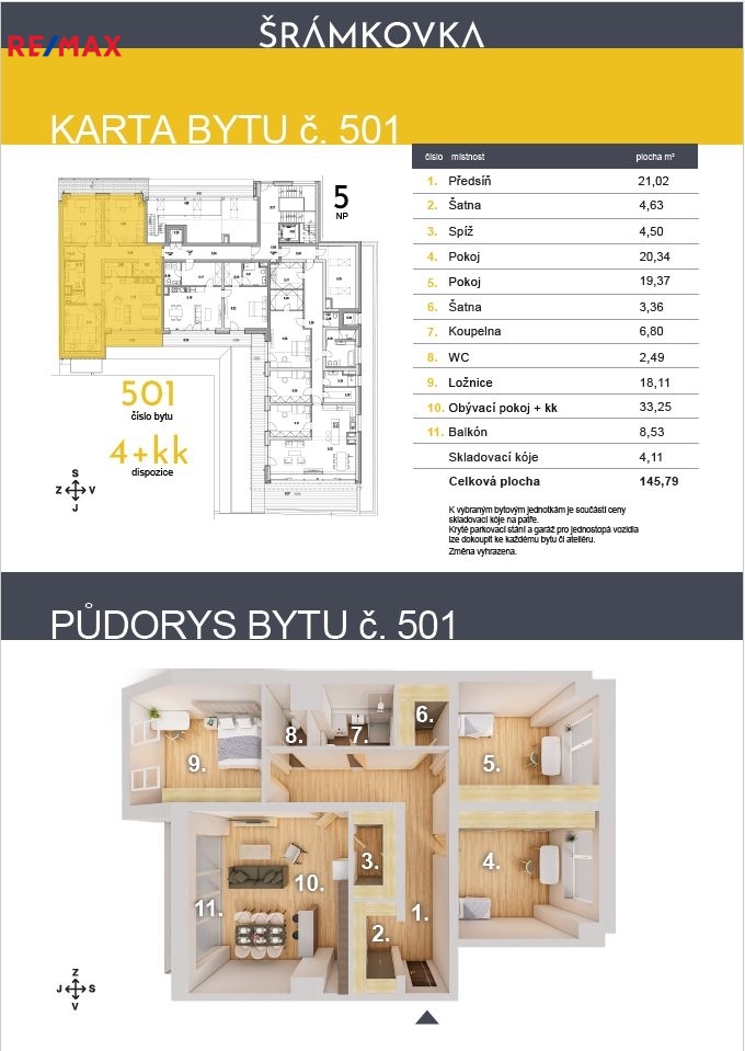 V projektu Šrámkovka nabízíme poslední 3 volné byty: 1x 3kk, 1x 4kk a 1x střešní Penthouse. Nabízíme ke koupi jedinečný byt v exkluzivním bytovém komplexu, který je ideální pro klidné rodinné bydlení. Architekt Jaromír Kročák ho projektoval s důrazem na velkorysé rozměry jednotlivých místnosti a spoustu úložných prostor. Součástí nabídky je byt s číslem 501. Toto velkoryse pojaté 4+kk nabízí plochu rodinného domu (užitná plocha 133 m2). Při vstupu vejdete do obří předsíně/šatny, jejíž velikosti je neuvěřitelných 21 m2. Obývací pokoj s kuchyňskou linkou svou velikostí atakuje byt 1+kk a má plochu 33,25 m2 + balkon 8,53 m2. Hlavní ložnice má 18,11 m2, dále 2 dětské pokoje, které se nachází na opačném konci bytu, což poskytuje maximální soukromí (20,3 m2 a 19,4 m2). Všechny místnosti v bytě mají samostatný vstup z centrální chodby, což zajištuje dokonalý komfort v bydlení. Samozřejmostí je jedno WC oddělené od koupelny a druhé jako součástí velmi prostorné koupelny o velikosti 6,08 m2. V bytě jsou k dispozici 2 šatny, jedna jako součástí prádelny, hned vedle koupelny (3,4 m2) a druhá jako hlavní šatna umístěná v předsíni (4,6 m2). Byt je orientovaný na jižní stranu do vnitrobloku a severní stranu směrem do klidné ulice. V ceně je prostorná skladovací kóje (4,11 m2) umístěná o patro níže. K bytu lze přikoupit jedno parkovací stání v prvním nadzemním podlaží za cenu 500.000,- Kč a uzamykatelnou garáž pro jednostopá vozidla umístěnou ve vnitrobloku za cenu 135.000,- Kč. Bytový dům je ve fázi před kolaudací stavby a vzniká v něm celkem 20 bytů, volné jsou jen poslední 3. Předání je plánováno na květen roku 2026. V bytě najdete prémiové materiály a značky: dubové podlahy s podlahovým vytápěním, vnitřní dveře SAPELI model Elegant Komfort s rozetovými klikami FO-NAXOS-HR, koupelnu a WC zařízené dlažbou a obklady zn. RAKO, nábytkovými umyvadly Sapho Kare s bateriemi Hansgrohe Vernis, sprchovou zástěnou zn. Hűppe, sanitou zn. Hansgrohe, WC systémem zn. Geberit, okna s trojsklem Otherm ALFA EVO. K největšímu jihočeskému OC IGY dojdete za 5 minut, dětské hřiště za rohem. 200 m od domu se nachází Palackého náměstí.. Celou oblast lemují významné dopravní tepny, které zaručující výbornou dopravní dostupnost. Na dálnici D3 jste za pouhých 5 minut. Samotná ulice a její okolí je přitom velice poklidná a dopravně nevytížená. 10 TOP projektu • Velké rozměry místností • Nadstandardní velikost balkonů a teras • Spousta úložných prostor • Prostorné sklady k bytům na patře • Podlahové vytápění • Posuvná francouzská okna s HS portály • V ceně předokenní rolety a klimatizace • Prostorná krytá parkovací místa • Uzavřené garáže pro jednostopá vozidla • Zelená zahrada Uvedená cena je včetně DPH. Výměry místností naleznete na přiloženém půdorysu. 3D model a grafika jsou pouze ilustrativní a nemusí odpovídat skutečnosti. Další informace naleznete na stránkách projektu Šrámkovka.