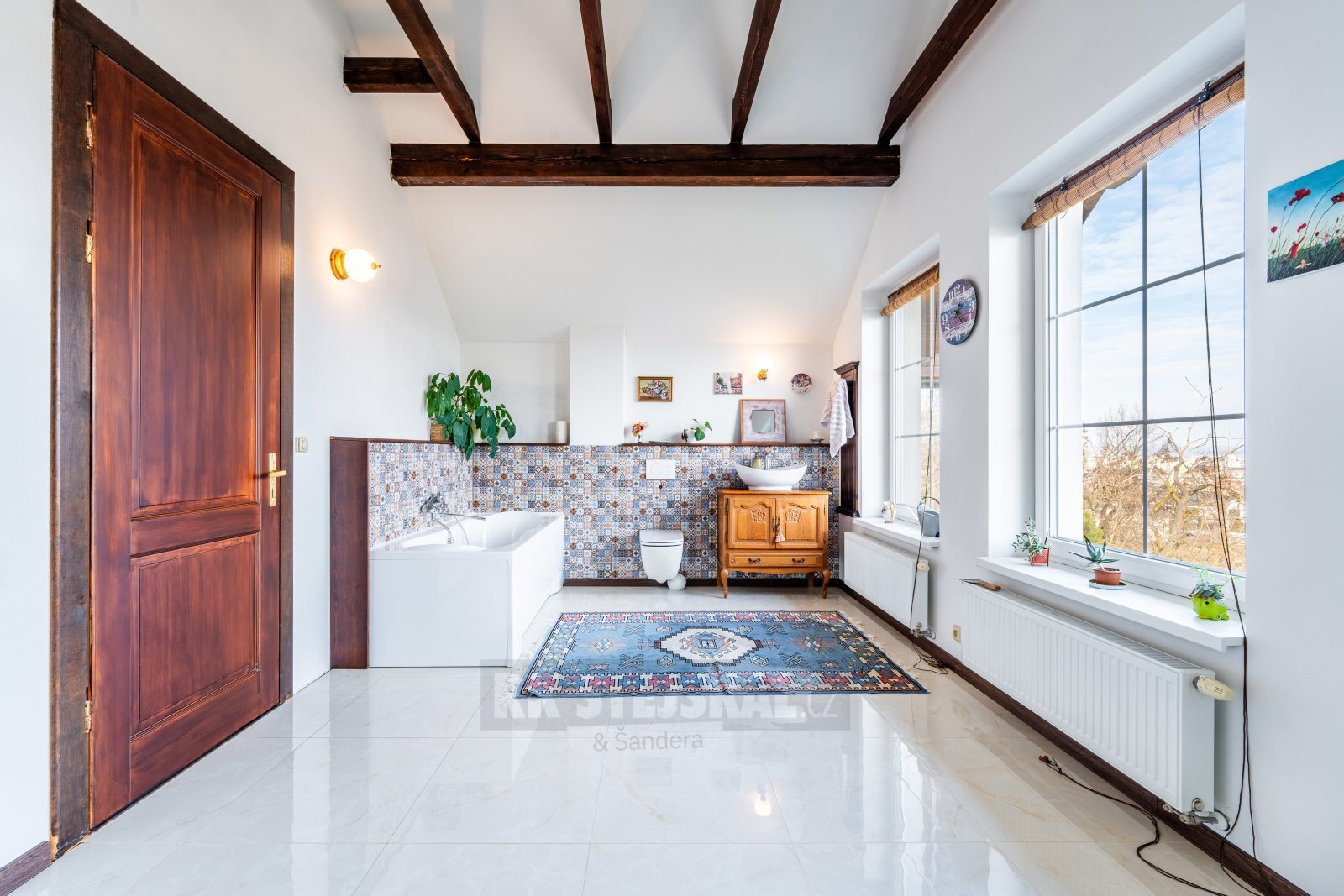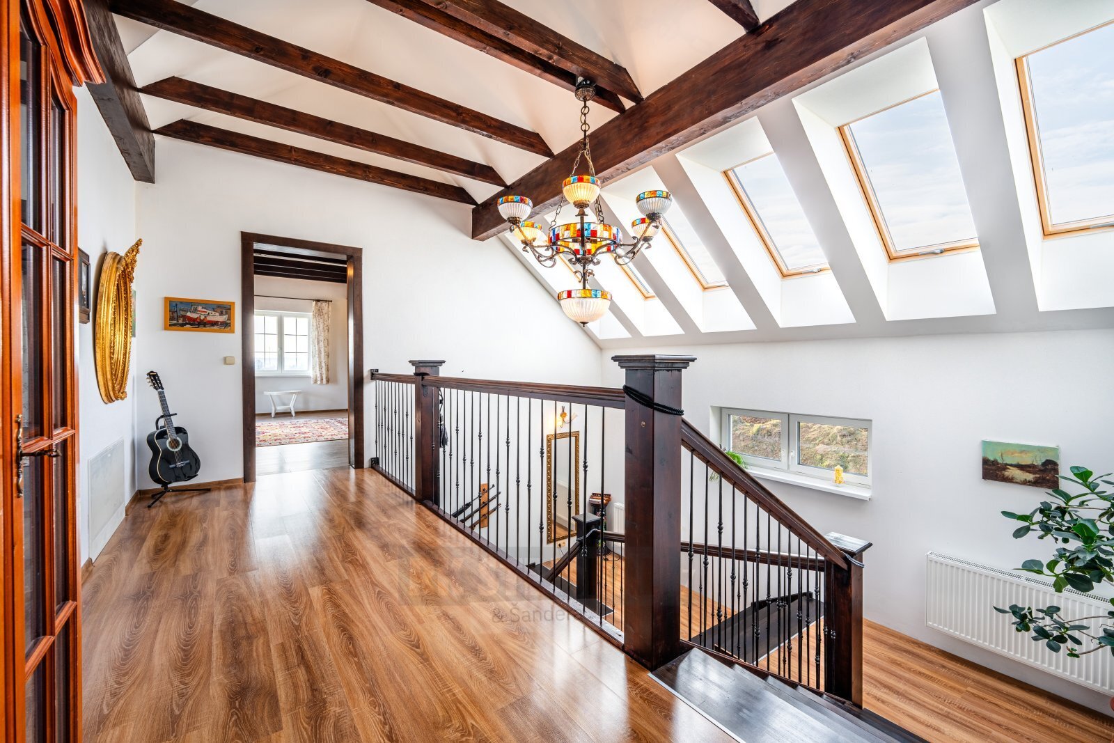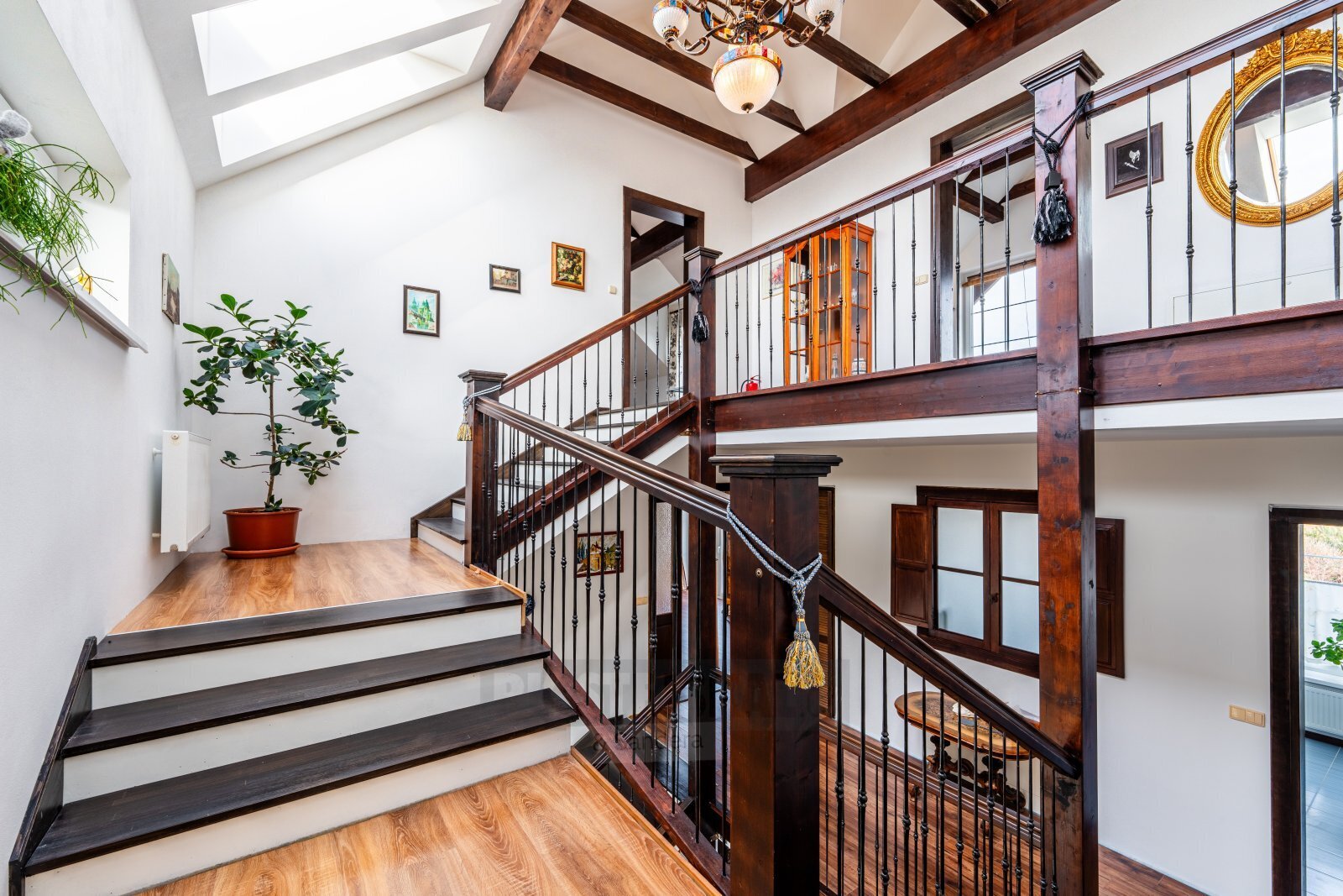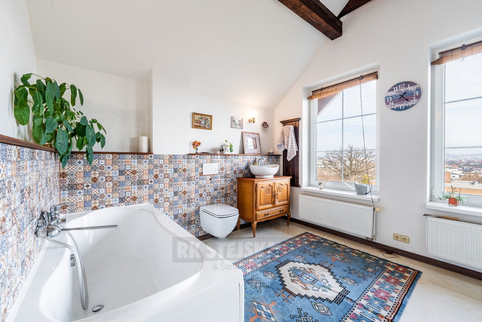 Nabízíme exkluzivní rodinnou vilu v prestižní a klidné části Českých Budějovic – Švábův Hrádek. Tento moderní dům s užitnou plochou 497 m² plus vytápěná zimní zahrada 33 m² byl zkolaudován v roce 2018 a nabízí luxusní bydlení pro náročné. Nemovitost se nachází na rovinatém pozemku, který zahrnuje pečlivě udržovanou zahradu se soukromým jezírkem plným dospělých ryb a bohatou ovocnou zahradou. Prostorné terasy s mimořádným výhledem na celé město a okolní zeleň nenechají nikoho lhostejným. Dům je rozdělen do tří podlaží a poskytuje maximální komfort pro rodinné bydlení. V suterénu se nachází kancelář (pracovna), technická místnost, kotelna, úložné prostory a velká hala o rozloze celkem 82 m2, izolovaná od soukromé plochy, která může být použita jako tělocvična nebo velká garáž nebo jako místnost pro komerční účely. Hlavní obytná část v 1. nadzemním podlaží se pyšní prostornou vstupní halou, která plynule navazuje na obývací pokoj a zimní zahrady. Útulná a prostorná kuchyně s jídelnou je vybavena špičkovými spotřebiči a nabízí dostatek prostoru pro rodinné stolování. Na stejném podlaží se nachází také obývací pokoj nebo pokoj pro hosty a koupelna se sprchovým koutem. Podkroví je vyhrazeno soukromé části domu. Dominantou je dvě ložnice, každá o rozměrech 53,5 m², které mají vlastní šatny. Z balkonů je nezapomenutelný výhled na staré město a park Stromovka. Dále zde nalezneme další prostornou a prosluněnou koupelnu s vanou. Veškeré dřevěné konstrukce a prvky, všechny stupně schodiště, interiérové dveře a kuchyňská linka jsou vyrobeny výhradně z přírodního masivního modřínu, dubu, buku nebo smrku ve střešních trámech. Vytápění zajišťuje dvouokruhový centrální domovní kotel s okamžitým přívodem teplé vody do jakéhokoli kohoutku v koupelně nebo kuchyni na jakémkoli patře a energeticky úsporné tepelné čerpadlo CTC EcoAir 420, na které je záruka do roku 2027. Díky kvalitní izolaci a moderním technologiím spadá nemovitost do energetické třídy B, což garantuje efektivní a úsporný provoz. V celém domě je vedeno podlahové vytápění a automatické řízení teploty, což vám zaručuje absolutní pohodlí v každém ročním období. Lokalita nabízí klidné a bezpečné bydlení s výbornou dostupností do centra Českých Budějovic. V okolí se nachází kompletní občanská vybavenost včetně škol, školek, obchodů, restaurací i sportovišť. Milovníci přírody ocení blízkost parků a cyklostezek. Tato výjimečná vila představuje jedinečnou příležitost pro ty, kteří hledají luxusní a prostorné bydlení na prestižní adrese.