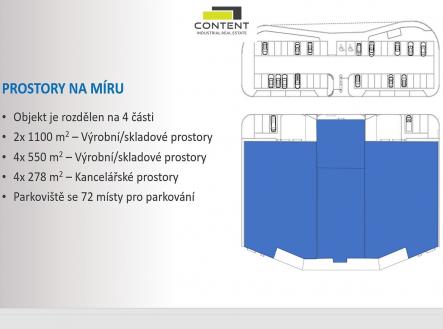 Pronájem skladu, výrobních nebo velkoobchodních prostor 2200 m² České Budějovice. V zastoupení majitele a bez provize nabízíme samostatnou část novostavby industriálních prostor, umístěné v komerčním areálu blízko centra města s výborným napojením na dálnici D3. - budova před dokončením, k dispozici na dotaz - 2200 m² vytápěné přízemní prostory - světlá výška 8,5 m - podlahy s nosností 5 t/m² - příprava na mostový jeřáb - 3 x přímý vjezd do haly, 1 x vrata s vyrovnávacím můstkem pro kamion - dostatek parkovacích míst - samostatné měření energií, přístupové systémy - LED osvětlení, EPS - areál přístupný 24/7 - k dispozici kvalitní kancelářské a sociální zázemí dle požadavku - kavárna s možností firemního stravování - v budově k dispozici také další skladové nebo výrobní prostory , celkem 2200 m² v přízemí a 2200 m² v patře s nákladním výtahem 5 t - možnost pronájmu celé budovy s užitnou plochou 4400 m² - prostory v budově jsou variabilní dají se propojovat a kombinovat dle potřeby Cena nájmu 135,-Kč/m²/měsíc + služby a energie. Pro více informací nás kontaktujte.