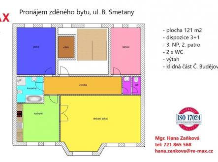 Nabízíme k pronájmu byt v klidné části v blízkosti centra města. Byt o dispozici 3+1 se nachází ve druhém patře (3.NP) zděného domu s výtahem. Užitná plocha bytu 121 m2. Do bytu se vstupuje chodbou (14 m2) ze které je přístup do všech místností bytu. Na sever je orientována ložnice (21 m2) a pokoj (17 m2); obývací pokoj (42 m2) s kuchyní (18 m2) jsou orientovány na jih. V kuchyni je kuchyňská linka je vybavena elektrickou troubou, sklokeramickou varnou deskou, vestavěnou myčkou a chladničkou, digestoří a dřezem. V bytě je nově zrekonstruovaná koupelna (7 m2) s vanou, sprchovým koutem, umyvadlem se zrcadlem, WC, otopným žebříkem a bojlerem. Dále se zde nachází umývárna s druhým WC. Nemovitost je vytápěna plynovým kotlem, napojena na vodu a kanalizaci. Všechny energie jsou měřeny samostatně. Nájemné 19.000,- Kč/měsíc energie: voda, elektřina a plyn- přepis na zájemce (cca 6.800,- Kč/ měs) poplatek RK 19.000,- + 21% DPH jistina (kauce) 40.000,- Kč Více informací u makléře nabídky