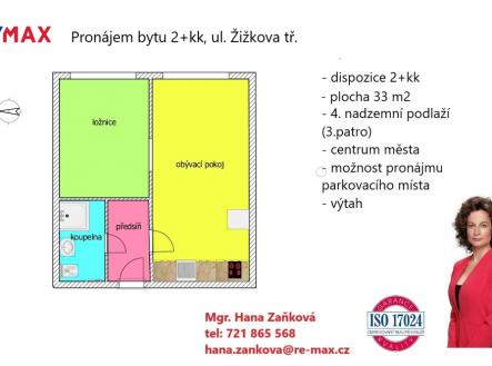 Nabízíme k pronájmu zrekonstruovaný byt 2+kk, umístěný v 3 NP multifunkční budovy v žádané lokalitě v blízkosti centra města v ulici Žižkova. Byt s dispozicí 2+kk (32,92 m2) je situován v nově kompletně zrekonstruovaném multifunkčním domě s výtahem, v lokalitě s veškerou občanskou vybaveností, skvělou dostupností MHD a v centru města. Do bytu se vstupuje předsíní (3 m2), ze které je vstup do pokoje s kuchyňským koutem a do koupelny. Pokoj s kuchyňským koutem o ploše 17 m2 je orientován na východ a je osazen kuchyňskou linkou s dřezem, sklokeramickou varnou deskou, troubou, myčkou, pračkou, mikrovlnnou troubou a ledničkou s mrazákem. Z pokoje s kuchyňskou linkou je vstup do ložnice. Koupelna má plochu 3 m2 a je osazena sprchovým koutem, umyvadlem, otopným žebříkem a WC. V případě potřeby je k dispozici recepce v areálu. Vše je patrné z plánku bytu v obrazové příloze. V případě zájmu lze k bytu pronajmout parkovací místo na dvoře domu za 1.452,- Kč/měsíc Byt je vhodný pro pracující nekuřáky bez domácích mazlíčků. Nájemné 11.900,- Kč + zálohy na energie (elektřina, voda, teplo) a služby 3.552,- Kč/měs. Vratná kauce 30.904,- Kč. Poplatek RK pouze 6.900,- + 21% DPH neboť část poplatku hradí pronajímatel Byt volný ihned.