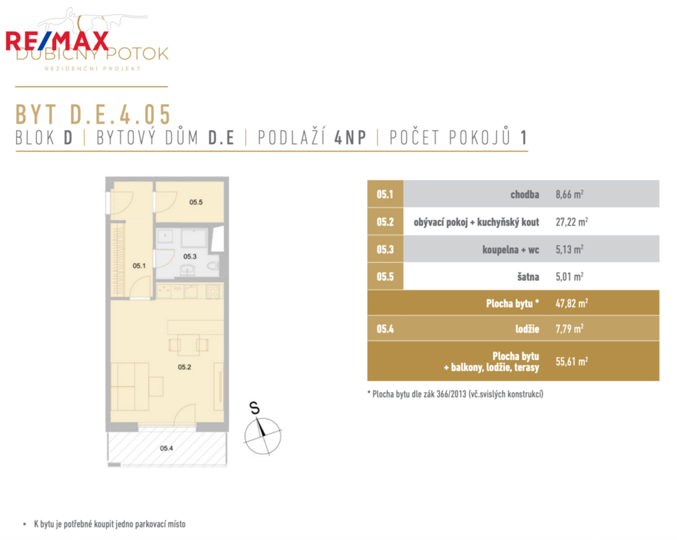 V ceně bytu od nás nyní získáte dárek v podobě vybavení od HANÁK NÁBYTEK v hodnotě 480 000 Kč ZDARMA. Přijďte se podívat do našeho vzorového bytu a zjistěte, co všechno jsme za tuto hodnotu dokázali zařídit! Tato nabídka je časově omezená a nevztahuje se na byty 1+kk. Kompletní nabídku bytů za akční ceny i další bonusy při rychlém jednání až do výše 150 000 Kč najdete na našem webu. Nabízíme bytovou jednotku D.E.4.05. Dispozice 2+kk za cenu 1+kk o celkové výměře 55,61 m2 vás nadchne svým komfortem a luxusním životním stylem. U vybraných bytů vám totiž nabízíme možnost úpravy dispozic formou příčky bez navýšení ceny. Touto úpravou si oddělíte spací prostor od obytné místnosti. Neumíte si to představit? Připravili jsme pro vás upravený půdorys, ve kterém vidíte i dispozici po úpravě. Plocha interiéru 47,82 m2 se zvětšuje o venkovní prostor v podobě lodžie s výměrou 7,89 m2, kde si vytvoříte svou odpočinkovou zónu na čerstvém vzduchu s výhledem do zeleného prostředí. Byt je připraven k okamžitému nastěhování. V projektu je k dispozici pohodlné parkování v podzemní garáži a zastávka MHD přímo před domem. V přízemí rezidence brzy vzniknou nové obchodní jednotky, mezi nimi dětská skupina, tetovací studio, kadeřnictví, kosmetika, kavárna a další služby. Nová rezidence Dubičný Potok nabízí moderní a klidné bydlení v zeleni s atriem, revitalizovanou vodní plochou, naučnou stezkou, přírodním hřištěm, workoutovým prostorem, komunitním grilem, interiérovou rezidenční fitness zónou 24/7 a dalšími prvky pro relaxaci. Veřejné prostranství je navrženo udržitelně – zelené střechy spolu s atriem pomáhají optimalizovat mikroklima budov. Součástí projektu je také cyklostezka, kolárna a myčka kol. S financováním vám ochotně pomůže naše finanční oddělení. V inzerátu jsou použity vizualizace.