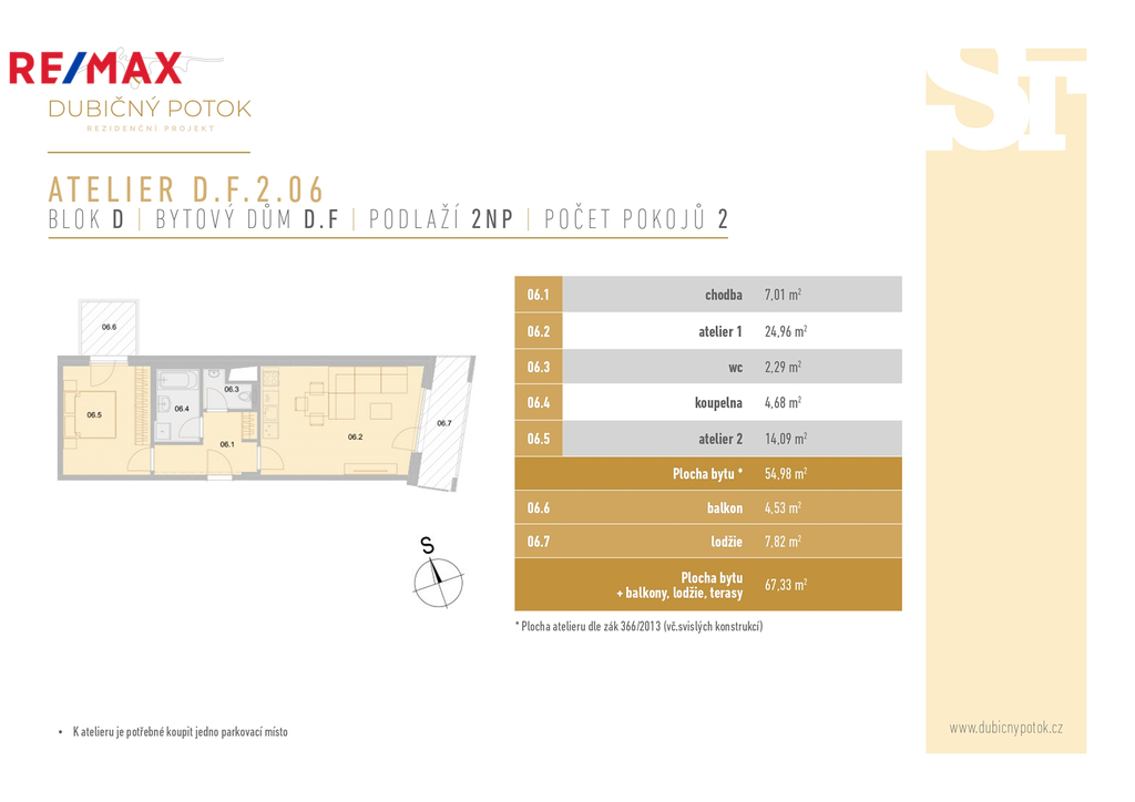 V ceně bytu od nás nyní získáte dárek v podobě vybavení od HANÁK NÁBYTEK v hodnotě 480 000 Kč ZDARMA. Přijďte se podívat do našeho vzorového bytu a zjistěte, co všechno jsme za tuto hodnotu dokázali zařídit! Tato nabídka je časově omezená a nevztahuje se na byty 1+kk. Kompletní nabídku bytů za akční ceny i další bonusy při rychlém jednání až do výše 150 000 Kč najdete na našem webu. Nabízíme exkluzivní bytovou/ateliérovou jednotku 2+kk (D.F.2.06) v rezidenci Dubičný Potok v Českých Budějovicích. K prostorné ploše 54,98 m² náleží také prostorná lodžie 7,82 m² a balkon 4,53 m², které poskytují dostatek soukromí i místa k odpočinku pro celou rodinu. Jednotka je připravena k okamžitému nastěhování. V projektu je k dispozici pohodlné parkování v podzemní garáži a zastávka MHD přímo před domem. V přízemí rezidence brzy vzniknou nové obchodní jednotky, mezi nimi dětská skupina, tetovací studio, kadeřnictví, kosmetika, kavárna a další služby. Nová rezidence Dubičný Potok nabízí moderní a klidné bydlení v zeleni s atriem, revitalizovanou vodní plochou, naučnou stezkou, přírodním hřištěm, workoutovým prostorem, komunitním grilem, interiérovou rezidenční fitness zónou 24/7 a dalšími prvky pro relaxaci. Veřejné prostranství je navrženo udržitelně – zelené střechy spolu s atriem pomáhají optimalizovat mikroklima budov. Součástí projektu je také cyklostezka, kolárna a myčka kol. S financováním vám ochotně pomůže naše finanční oddělení. Fotografie byly pořízeny ve vzorovém bytě 2+kk.