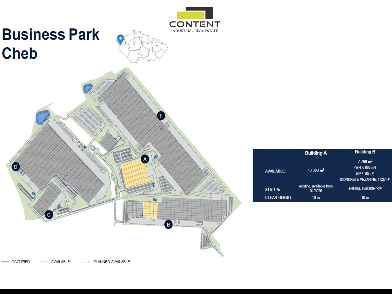 Pronájem skladových, výrobních prostor Cheb. V zastoupení majitele a bez provize nabízíme nové komerční, velice kvalitní výrobní nebo skladové prostory v komerčním areálu s ostrahou, v blízkosti dálnice D6. - existující prostory, k dispozici IHNED - skladové, výrobní prostory13389 m² - kanceláře dle požadavku - vjezdy v úrovni vozovky i z hydraulických ramp - světlá výška 10 m - podlahy s minimální nosností 5 t/m² - vytápění plynem, denní světlo dle norem, sprinklery - nosné sloupy 12 x 24 m - kanceláře, vzorkovna, zázemí dle požadavku na míru - bezproblémový příjezd z dálnice i pro TIR, parkování - lze rozdělit od cca 5000 m² Cena bude stanovena individuálně. Použité fotografie jsou ilustrační. Pro více informací nás kontaktujte.