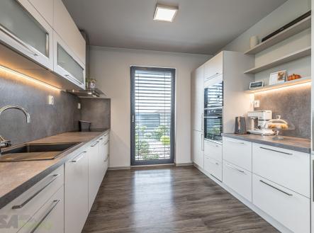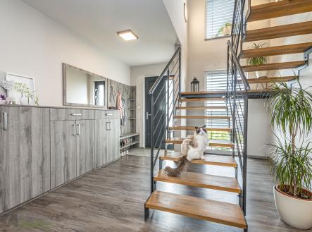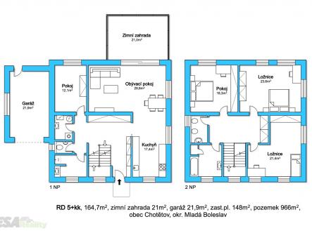 Nabízíme k prodeji nadstandardní rodinný dům 5+kk o obytné ploše 164,7 m² se zimní zahradou 21 m², garáží 28 m² a celkovou výměrou pozemku 966 m². Dům se nachází v klidné lokalitě v ulici Na Výsluní, obec Chotětov. Jedná se o moderní nízkoenergetickou novostavbu zkolaudovanou v roce 2020 s důrazem na kvalitu provedení, praktičnost a pohodlí, která nabízí příjemné rodinné bydlení s výbornou dostupností do Prahy, Mladé Boleslavi či Benátek nad Jizerou. Dům je vybaven tepelným čerpadlem LG Therma V se zásobníkem vody o objemu 200 litrů a podlahovým vytápěním. Obvodové zdivo je z Ytongu o tloušťce 30 cm, doplněné o 16 cm zateplení, střešní krytinu tvoří pálené tašky. V obývacím pokoji se nachází velký hliníkový HS portál, ostatní okna jsou plastová s trojskly. Venkovní hliníkové žaluzie Climax jsou napojené na chytrou domácnost Somfy, kterou lze ovládat přes aplikaci, stejně jako vjezdová vrata a kameru u vstupu. Podlahy jsou řešeny kombinací vinylu a PVC, v koupelnách a technických místnostech je položena dlažba. V domě jsou dvě koupelny, dvě samostatné toalety a hliníkové bezpečnostní dveře. Součástí domu je prosklená zimní zahrada, která je ze všech stran otevíratelná a poskytuje příjemný prostor k odpočinku. Vybavení, které je součástí domu: kuchyňská linka Oresi Livanza se spotřebiči Electrolux (lednice, myčka, trouba, varná deska, digestoř), zahradní nábytek Hartman, věšákový panel s botníkem a komodou, vestavěné skříně na míru (celkem 4 sestavy). Další vybavení je možné dohodnout individuálně. Dispozice domu: 1.podlaží – prostorná vstupní chodba s vestavěnou skříní, koupelna se sprchovým koutem, samostatné WC, technická místnost, ložnice, kuchyňský kout, obývací pokoj se vstupem do zimní zahrady a garáž. 2.podlaží – chodba s vestavěnou skříní, tři ložnice, koupelna s vanou a sprchou, samostatné WC s bidetem. Pozemek je kompletně oplocen, přední část tvoří hliníkový plot LuxLine. Před domem se nachází prostorná plocha ze zámkové dlažby s možností pohodlného parkování pro více vozů, chodníky okolo celého domu, okrasné bezúdržbové záhony v přední i zadní části pozemku, živý plot po obvodu zahrady a studniční vrt. Dům sousedí pouze s jedním rodinným domem, za ním se nachází pruh udržovaného trávníku a vedle domu je plánován park sloužící jako klidová zóna. Občanská vybavenost: školka, základní škola, pošta, knihovna, obchody, fitness, sportovní areál, restaurace, dobrovolný hasičský sbor, zásilkové boxy (AlzaBox, ZBox, DPD). Dopravní dostupnost na metro B Černý Most je 30min po R10, Mladá Boleslav 15min. jízdy autem nebo PID vlak a bus. Možnost financování hypotečním úvěrem. Energetická náročnost B - Velmi úsporná.
