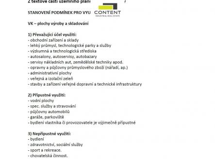 Prodej komerčního pozemku Chrášťany. Bez provize nabízíme rovinatý komerční pozemek o výměře: 10158 m² určený územním plánem na plochy (VK) výroby a skladování. Pozemek je dobře přístupný ze sjezdu z Pražského okruhu D0 EXIT 23A. - celková rozloha pozemku: 10747 m² - vhodné využití: výroba, sklad, technologický park, obchod, opravny, autoservisy, autopůjčovny, administrativa, - koeficient zastavění: 30 %, resp. 40 % (v případě krytých parkovišť); 40 % v případě transformace území ‐ min. plocha zeleně 30 %. ‐ výškové omezení max. 12,5 m; pro lokality Z2 je výjimečně možná výška až 15 m - na pozemek nejsou zavedeny inženýrské sítě - součástí prodeje pozemku budou parcely pro budoucí příjezdovou komunikaci - je možný prodej nemovitosti i obchodní společnosti vlastnící pozemek Cena za prodej pozemku je Kč 2.500/m² + DPH Doporučujeme prohlídku nemovitosti a na vyžádání rádi sdělíme další informace.
