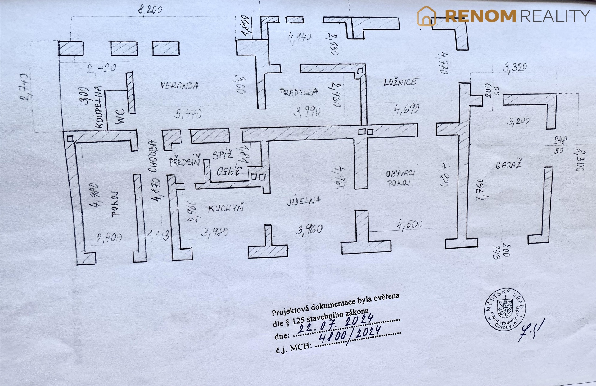 Prodej rodinného domu 4+1 se zahradou a garáží, ul. Hrad, Chropyně. Jedná se o koncový řadový dům s 1 nadzemní podlažím (bez obytného podkroví). Za domem se nachází rozsáhlá zahrada 2.545 m2 navazující na Zámecký rybník (klidné místo). Možný příjezd k zahradě přes polní cestu. Celková plocha pozemků činí 2.999 m2. Na pozemku se dále nacházejí vedlejší stavby - garáž, hospodářská stavba a drobné hospodářské přístavky. Základy domu jsou kamenné, cihelná konstrukce. Tloušťka obvodových zdí činí 45 cm. Stropy jsou dřevěné trámové, střecha je sedlová, krytinu tvoří pálená taška. Dům byl postaven v roce 1927. Na severní straně domu byla v 80. letech přistavěna garáž s pultovou střechou. V roce 2020 proběhla rekonstrukce koupelny. Do domu zavedeny tyto sítě: elektřina o napětí 230/400 V, voda je přivedena z obecního vodovodu, svod splašků je řešen do jímky, zemní plyn. Vytápění zajišťuje kotel na tuhá paliva + lokálně kamny na tuhá paliva, ohřev vody zajišťuje plynový průtokový ohřívač. Dispozice domu: Chodba 5,63 m2, Pokoj 12,00 m2, Kuchyně 19,20 m2, Pokoj 20,00 m2, Pokoj 22,50 m2, Pokoj 22,42 m2, Místnost 16,50 m2, Kotelna 9,84 m2, Koupelna 7,20 m2, WC 1,11 m2, Sklep 6,80 m2, Garáž 24,96 m2. Podlahová plocha 136,40 m2. Podlahová plocha vč. příslušenství 168,16 m2. Rodinný dům je postaven ve střední části obce a charakter okolí odpovídá rezidenční zástavbě rodinnými domy se zahradami. V místě je dostupná základní škola. V obci se nachází pobočka České pošty. Lokalita se zanedbatelným nebezpečím výskytu záplav. Zastávka vlakových a autobusových spojů a parkovací možnosti jsou dobré na vlastním pozemku. Průkaz energetické náročnosti budovy prozatím nevyhotoven – třída G. Další informace u makléře nemovitosti.