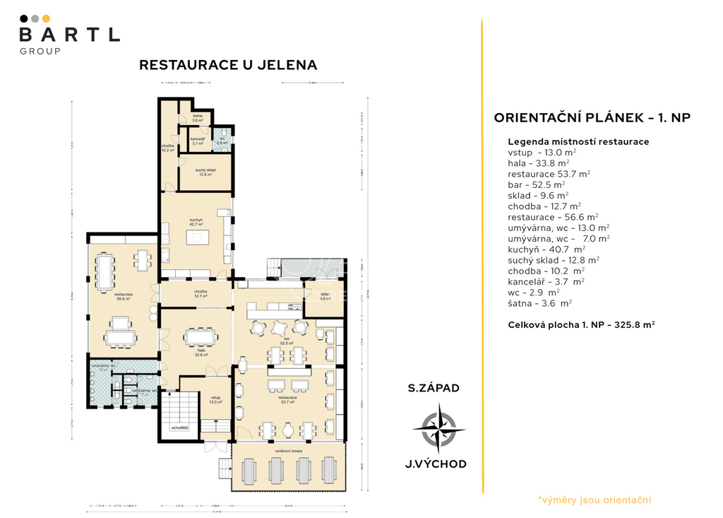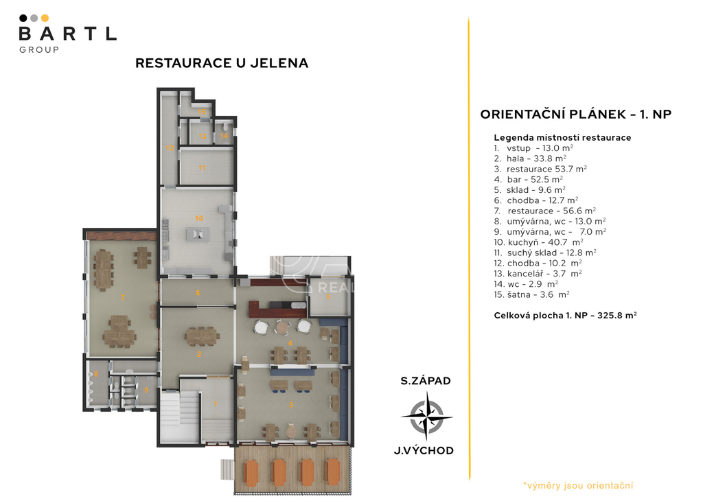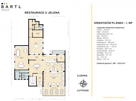 Dobrý den, společně s majitelem nabízíme k pronájmu nebytové prostory určené k provozu restaurace U Jelena, nacházejících se uprostřed Chvalšin, hned u hlavního tahu Český Krumlov – Prachatice, v těsné blízkosti kostela sv. Máří Magdalény. Prostory se nachází v přízemí objektu a disponují samostatným vstupem, restaurační částí s barem, salónkem, sociálním zázemím pro hosty, kuchyní, několika sklady a zaměstnaneckým zázemím. Celková plocha činí 320 m². Kapacita vnitřních prostor je 105 míst k sezení a venkovní terasa poskytne dalších 35 míst. Celková kapacita tedy dosahuje až k 135 míst k sezení. Parkování pro hosty zajistí veřejné parkoviště podél návsi přímo před restaurací. Prostory jsou vhodné pro běžný gastronomický provoz, ale také pro svatby, rodinné oslavy či firemní akce. V případě rychlého převzetí lze využít současný personál a pokračovat bez přerušení provozu. Dále je možné po dohodě převzít stávající již uskladněné zásoby, celý brand restaurace, veškeré marketingové materiály a webové stránky včetně sociálních sítí. Restaurace profituje z výhodné polohy – v letní sezóně se ve Chvalšinách konají různé společenské a kulturní akce, obcí projíždí nespočet cyklistů a turistů směřujících na Šumavu či do Českého Krumlova a navíc zde funguje i velký kemp, jehož hosté restauraci pravidelně využívají. Díky těmto faktorům má restaurace velký potenciál k zajímavým výnosům. Měsíční nájemné činí 30.000 Kč bez DPH + měsíční zálohy na energie a služby se nastavují na základě budoucího provozu. V restauračním provozu jsou měsíční náklady na energie okolo 36.000 Kč = elektřina 25.000 Kč, plyn 8.000 Kč, voda 3.000 Kč, internet 500 Kč a poplatky obci. Veškeré energie se zatím nebudou přepisovat na nájemce. Kauce ve výši dvou měsíčních nájmů je splatná při předání prostor. Jednorázový poplatek za zprostředkování nájmu činí 15.000 Kč + DPH 21 %. Díky poloze v centru obce Chvalšiny, blízkosti Českého Krumlova a poloze u hlavního tahu na Prachatice nabízejí prostory snadnou dostupnost a stabilní klientelu – ideální příležitost pro vaše gastro podnikání s potenciálem dlouhodobě zajímavých výnosů. Tak nás neváhejte kontaktovat, těšíme se na slyšenou a na viděnou, BartlGroup.