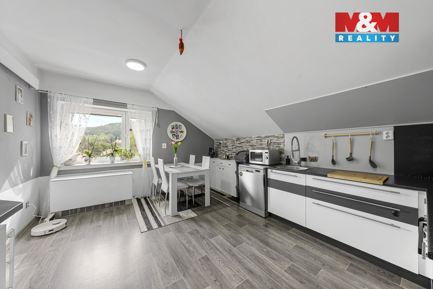 Nabízíme k prodeji prostorný byt 5+1 s garáží v osobním vlastnictví o užitné ploše 98 m² v klidné části obce Děčín X-Bělá, ulice Sněžnická. Byt se nachází v cihlovém domě o třech bytových jednotkách a díky podílu na zahradě poskytuje komfort bydlení srovnatelný s rodinným domem. Vytápění je zde řešeno akumulačními kamny, ohřev vody zajišťuje bojler. Dispozice bytu je tvořena vstupní chodbou, obývacím pokojem, kuchyní, třemi ložnicemi, šatnou a dvěmi koupelnami. Okolí nabízí klid a soukromí, ideální pro ty, kteří hledají útočiště od ruchu města, ale chtějí mít vše potřebné v dosahu. K bytu také náleží sklepní prostory. Skvělá lokalita v Bělé u Děčína zaručuje příjemné bydlení s kompletní občanskou vybaveností nedaleko. Pro více informací a domluvení prohlídky kontaktujte makléře. Optimální financování Vám zdarma zajistí naši hypoteční specialisté.