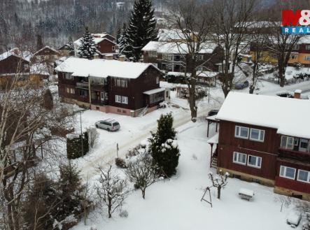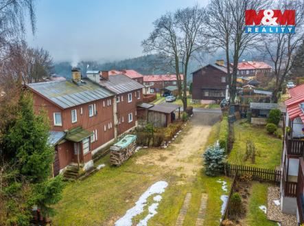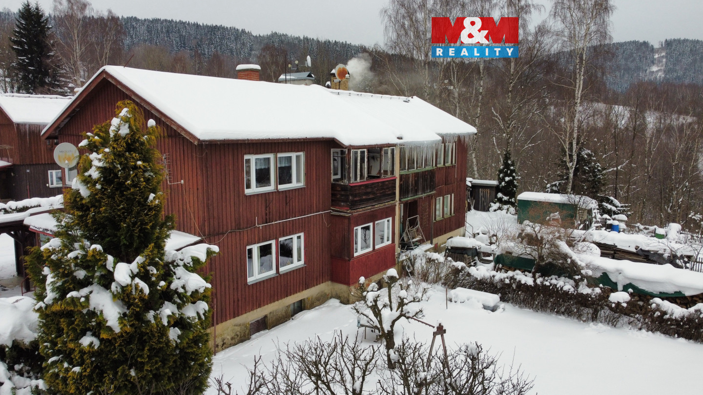 Nabízíme k prodeji dům se dvěma byty a pozemky o celkové výměře 476 m2 v Desné v Jizerských horách. Nemovitost je tzv. finský domek a je součástí několika stejných staveb na krásném klidném místě s výhledem v místní části Desná I. Celý objekt je podsklepený, v přízemí se nachází bytová jednotka 2+1 s pracovnou a zimní zahradou. V 1. patře je téměř identický byt 2+1 s balkonem. Obě bytové jednotky mají samostatný vstup. Na udržované zahradě stojí přístřešek pro automobil a sklad na nářadí. Dům je vhodný k trvalému bydlení i rekreaci díky mnoha ski areálům v těsné blízkosti, může ale sloužit i jako investice k pronajímání.