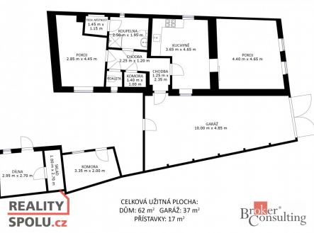 Útulný rodinný dům 2+1 se zahradou – ideální pro bydlení i rekreaci Hledáte klidné bydlení nebo chalupu na víkendy? Tento rodinný dům v obci Dobelice nabízí pohodovou atmosféru, dostatek soukromí a hlavně prostornou zahradu, kde si užijete odpočinek, zahradničení i rodinná setkání. Dobelice jsou klidná obec obklopená přírodou, ideální pro rodinné bydlení i chalupaření, s dobrou dostupností do Znojma. Dům se nachází v klidné části obce. Je vhodný jak pro rodinu s dětmi, tak pro starší pár nebo jako chalupa k odpočinku a nabytí energie. Nemovitost má celkový pozemek o výměře 1172m2, který poskytuje spoustu prostoru pro relax, grilování nebo vlastní zahradní projekty. Podrobnější dispozice: - Celková užitná plocha činí 62m2 - Kuchyně 14,5m2 - Obývací pokoj 20,5m2 - Ložnice 12m2 - Koupelna 4,9m2 - Zastřešený průjezd "garáž" 37m2 - Přístavky 17m2 (sklad, dílna, apod.) Výhody domu - Plastová okna a vchodové dveře - Plechová krytina střechy, konstrukce v dobrém stavu - Betonové podlahy v celém domě, plovoucí podlahy v kuchyni a obývacím pokoji - Ústřední vytápění kotlem s podavačem na tuhá paliva - nízké náklady na vytápění - Nemovitost je vhodná jak pro trvalé bydlení, tak i jako rekreační dům v atraktivní přírodní oblasti - Dostupnost do větších měst - Znojmo 20min, Brno 45min - A autem jste do 30min v turistické vinařské oblasti Pálavy :) Pro sjednání prohlídky nás kontaktujte.