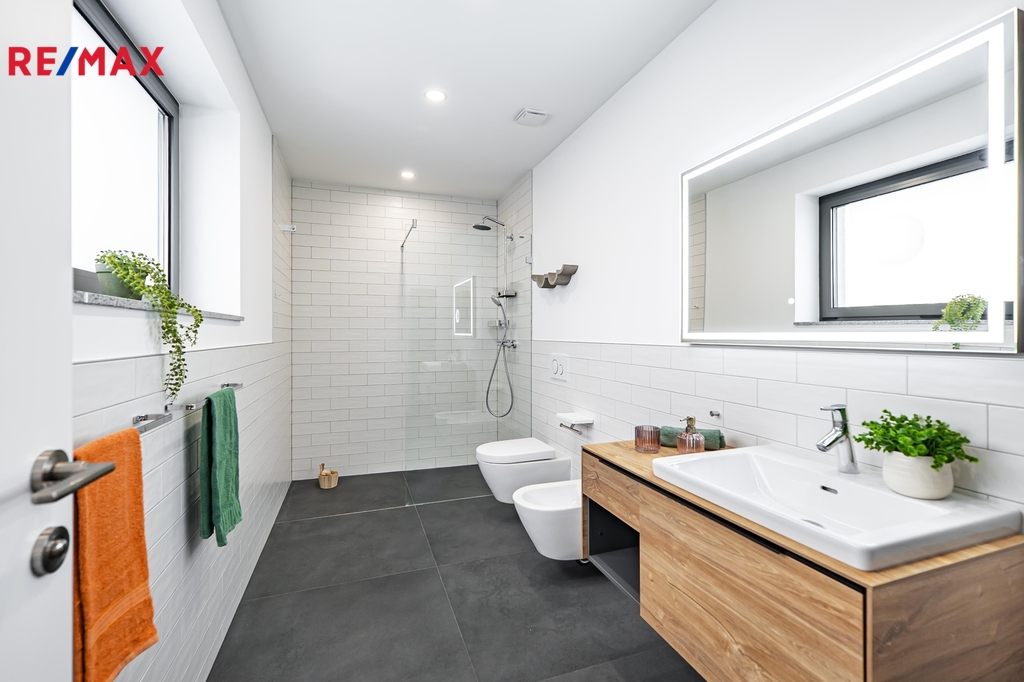 Nabízíme vám dvoupodlažní rodinný dům o dispozici 4+kk, který se nachází v malebné obci Dobřejovice, v atraktivní lokalitě nedaleko Prahy. Užitná plocha domu činí 141 m2, přičemž pochozí půda poskytuje dalších 20 m2 prostoru. K dispozici je také technická místnost, spižírna a samostatná šatna. Tento dům byl zkolaudován v roce 2020 a je ve velmi dobrém stavu. Dominantou interiéru je velký obývací pokoj s krbem, který harmonicky navazuje na moderní kuchyňský kout s žulovou pracovní deskou, jehož součástí jsou kvalitní spotřebiče – lednice, myčka, indukční varná deska, trouba, digestoř. Dům disponuje dvěma koupelnami a třemi toaletami, což uvítá vícečlenná rodina. Nechybí plovoucí podlahy v kombinaci s keramickou dlažbou a italská designová světla. Z obývacího pokoje je přímý vstup na terasu s bioklimatickou pergolou se 2 roletami, která poskytne příjemné místo pro posezení a relaxaci. Dům je zateplen a je vybaven hliníkovými okny. K vytápění a ohřevu vody slouží tepelné čerpadlo Nibe (voda/vzduch) a kromě podlahového topení je zde také podlahové chlazení pro letní dny. Energetická náročnost spadá do velmi úsporné klasifikační třídy B, což zajistí nízkou spotřebu a náklady na bydlení. Výhodou je také minimální údržba domu. Na pozemku o výměře 678 m2 se nachází také vedlejší stavba s plochou 20 m2, která je vyhřívána i chlazena klimatizací a může být ideálním prostorem pro podnikání, výrobnu nebo domácí kancelář. Zahrada je osázena ovocnými stromy a keři a je vybavena závlahovým systémem. K parkování vám poslouží venkovní parkovací stání. Dopravní dostupnost je zde výborná, autobusová zastávka se nachází přímo u domu a pohodlně tak dojedete za 15 minut na metro. Pokud se rozhodnete cestovat autem, tak spojení s Prahou je po dálnici D1. Obec disponuje základní občanskou vybaveností, máte zde potraviny, restauraci, poštu a rodiny s dětmi ocení místní jesle a školku. Obchodní zóna Čestlice se spoustou obchodů a služeb je vzdálena necelé 3 km a najdete zde i oblíbený Aquapalace Praha. Na procházku se můžete vydat do nedalekého Průhonického parku. Tento dům je skvělou volbou pro ty, kteří hledají klidné místo k bydlení v dosahu hlavního města. Pokud vás naše nabídka zaujala, neváhejte se ozvat a rádi vám poskytneme další informace.