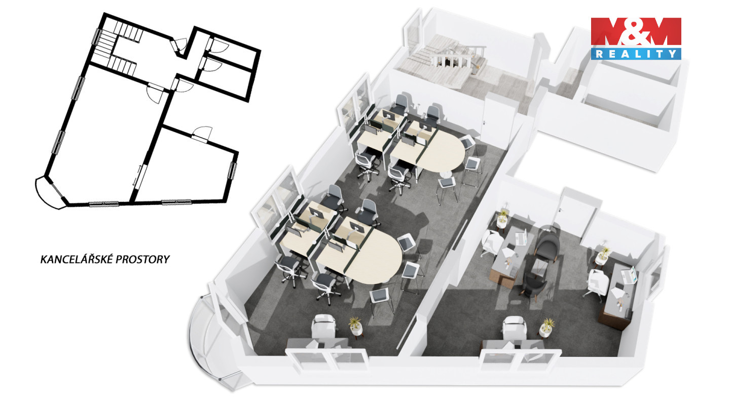 Hledáte reprezentativní kancelář v centru Dobrušky? Nabízíme k pronájmu světlé a moderní kancelářské prostory o celkové výměře 66 m², které se nachází jen pár metrů od náměstí F. L. Věka. Prostory jsou situovány v 2. NP udržované budovy a jsou ve velmi dobrém technickém stavu. Kancelář je plně klimatizovaná, částečně vybavená kancelářským nábytkem a připravená k okamžitému užívání. Nechybí zde ani datová síť pro připojení k internetu a elektronický zabezpečovací systém pro maximální bezpečnost. Díky své dispozici a vybavení jsou prostory vhodné jak pro jednotlivce, tak i pro menší tým. Nabízí příjemné a funkční zázemí pro jakoukoli moderní kancelářskou činnost – ideální pro obchodníka, účetní, konzultanta, advokáta nebo menší firmu. Parkování je možné v blízkém okolí a výhodou je i kompletní občanská vybavenost. Pokud hledáte prostory, které podpoří Vaše podnikání a zároveň nabídnou příjemné pracovní prostředí, určitě neváhejte kontaktovat makléře.