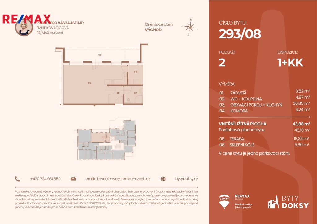 Výměry podle prohlášení vlastníka: 45,1 m² + balkón 19,2 m² + sklep 5,6 m² + parkovací stání Dokončení: 12/2026 Nabízíme slunný byt 1+kk o podlahové ploše 45,1 m² ve 2. nadzemním podlaží nově vznikajícího bytového domu. Projekt Byty Doksy vzniká citlivou přestavbou původního industriálního objektu v klidné ulici v docházkové vzdálenosti od centra i přírody. V Doksech je dlouhodobě nedostatek moderních byt§ s velkým balkónem – tato jednotka je proto na trhu ojedinělou příležitostí. Hlavní výhody bytu - byt 1+kk s možností individuálního dispozičního a materiálového řešení - balkón 19,23 m² orientovaná na východ - úložné prostory – samostatný sklep v ceně - venkovní parkovací stání - vysoký standard provedení včetně podlahového vytápění, předokenních žaluzií a přípravy na klimatizaci - výtah v domě Standard provedení bytu (v ceně) - podlahové vytápění – elektrické, každý pokoj má vlastní termostat; obytné místnosti lze ovládat přes Wi-Fi - plastová okna s izolačním trojsklem - předokenní elektrické žaluzie - příprava na klimatizaci ve všech pobytových místnostech - walk-in sprcha, keramické obklady, kvalitní sanitární vybavení - lepené vinylové podlahy v obytných místnostech, dlažba v koupelnách a technickém zázemí - bezpečnostní vstupní dveře, alarm - nadstandardní výška interiérových dveří Společné prostory - 17 parkovacích stání, z toho 10 s přípravou na dobíjecí stanici - renovovaná studna v rámci společného venkovního prostoru - příprava pro střešní fotovoltaiku Lokalita: Doksy – klid, příroda, dostupnost Bytový dům se nachází v klidné části města, přitom jen pár minut chůze od centra. Cyklostezky, lesy a veškerá občanská vybavenost na dosah. Máchovo jezero je v docházkové vzdálenosti, přičemž poloha domu nabízí klidné celoroční bydlení. Cena a možnosti klientských úprav Dokončení je plánováno na konec roku 2026, v této fázi je možné přizpůsobit materiály i detaily interiéru podle vašich představ. Ráda vám poskytnu kompletní dokumentaci, půdorys, technické podklady i detailní informace o celém projektu.