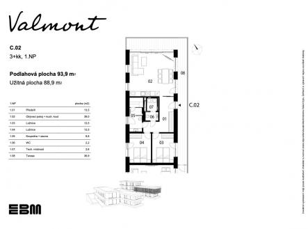 Apartmán C.02 o podlahové ploše 93,9 m² je jedním z 8 luxusních a jedinečných apartmánů nad jezerem v projektu Valmont. Zde můžete život vychutnávat všemi doušky. Valmont v sobě ztělesňuje svobodu, nespoutanost a požitek. Osobitý a nezaměnitelný styl otisklo do interiérů věhlasné architektonické studio Morix. Návrhy s důrazem na využití přírodních materiálů vznikaly s vidinou navození lahodné atmosféry v souznění s okolní přírodou. Interiér se stane místem, kde se nebudete nijak omezovat a v každém ročním období a za každého počasí se budete cítit příjemně a užívat si uklidňující výhled na jezero i ničím nerušený relax v sauně. Bude to bezpečným úkryt i skvělý výchozí bod pro výpravy za dobrodružstvím i zážitky. Nekonečné množství panoramat a uklidňujících výhledů na romantickou krajinu. Váš budoucí dalekohled nad jezerem. Více informací naleznete na webových stránkách developera projektu EBM Group.