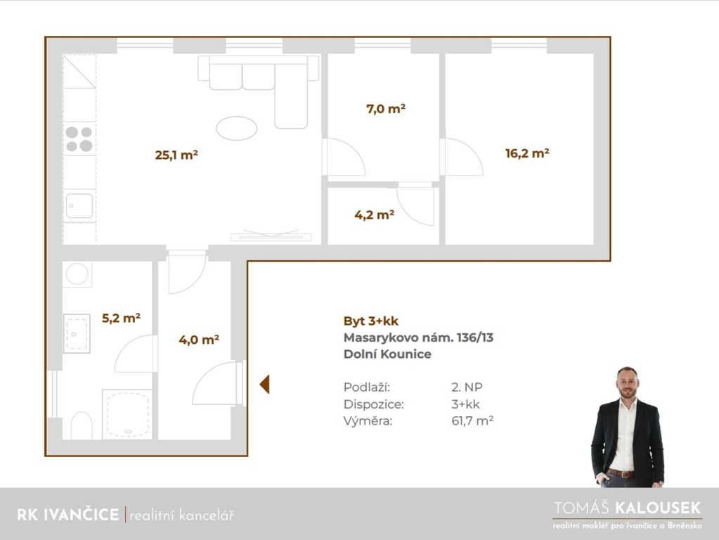 Nájem nadstandardního bytu 3+kk s klimatizací v centru historických Dolních Kounic. Byt o výměře 61 m2 se nachází v 1. patře (2.NP) historického domu a zahrnuje prostornou vstupní chodbu, koupelnu s praktickým oknem, velký obývací pokoj s kuchyňskou linkou na míru, průchozí pokoj se šatnou a další obytnou místností vybavenou klimatizační jednotkou. Možnost využít skladovací prostory ve dvoře domu pro uskladnění sezónních věcí. VYBAVENÍ: Kuchyňská linka včetně myčky, indukční varné desky, trouby, digestoře a LED osvětlení. Další vybavení dle individuální domluvy. Koupelna se sprchovým koutem, umyvadlo se skříňkou, zrcadlo s osvětlením, příprava na pračku. Nový el. bojler na ohřev teplé vody a elektrokotel na vytápění. Energie máte pod kontrolou - podružný vodoměr i elektroměr. NÁKLADY: 15.500,- Kč/měs. nájemné 500,- Kč/měs./osoba zálohy na vodné a stočné 3.500,- Kč/měs. zálohy na elektřinu PENB prozatím nedodán, proto kategorie G. Před zahájením nájmu je hrazena jistota 31.000,- Kč a provize 15.500,- Kč. Dostupné od 1. března 2026. Hledá se dlouhodobý spolehlivý nájemník. Smlouva na 1 rok s možností prodloužení v případě oboustranné spokojenosti. LOKALITA: Dolní Kounice, malebné město s bohatou historií a přibližně 2 500 obyvateli, leží v údolí řeky Jihlavy, jen 25 minut jízdy od Brna. Díky Integrovanému dopravnímu systému Jihomoravského kraje se snadno dostanete i do dalších okolních měst, jako jsou Ivančice nebo Moravský Krumlov. Dolní Kounice jsou vyhlášené svými památkami. Dominantou je monumentální gotický klášter Rosa coeli (Růže nebes), který láká návštěvníky svou tajuplnou atmosférou. Milovníci historie ocení také místní zámek, židovskou synagogu nebo příjemné procházky po okolí. Místní vinice a sklípky nabízejí ochutnávky skvělých vín, díky nimž si Dolní Kounice vysloužily pověst jedné z nejlepších vinařských lokalit na Moravě. Pokud máte rádi pohyb, okolní kopce, vinohrady a lesy nabízejí trasy pro cykloturistiku i pěší výlety. Ve městě najdete základní i mateřskou školu, obchody a restaurace. Pro volný čas nechybí sportovní areál, dětská hřiště nebo možnost projížďky na koni. Pestrý společenský život podporují četné kulturní akce, jako koncerty pod širým nebem nebo vinařské akce (např. "Putování za kounickou Frankovkou"). Dolní Kounice spojují kouzlo historického městečka s výhodnou polohou a pohodlím moderního života. Tady se historie, příroda a kvalitní bydlení potkávají na jednom místě. Průkaz energetické náročnosti budovy nebyl prozatím dodán, proto je uvedena energetická třída G. Zavolejte mi nebo se zastavte na kávu v kanceláři a rád Vám dodám bližší informace. Tomáš Kalousek - Realitní makléř pro Ivančice a Brněnsko RK IVANČICE | realitní kancelář Palackého nám. 2/5, Ivančice