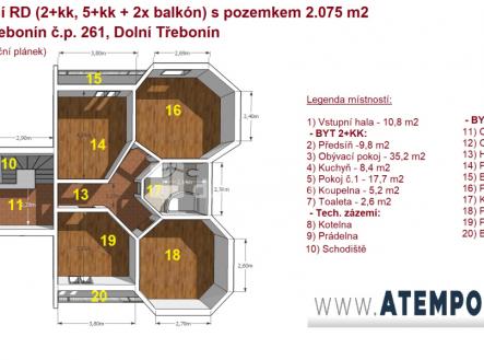 Naše společnost Vám zprostředkuje prodej dvougeneračního rodinného domu (2+kk, 5+kk + 2x balkón) s pozemkem o výměře 2.075m² v klidné části obce Dolním Třebonín, 17 km od města České Budějovice a 9 km od města Český Krumlov. Rodinný dům v udržovaném stavu má 2 nadzemní podlaží a užitnou plochu 253 m². Rodinný dům je rozdělen na dvě bytové jednotky (1.NP - přízemí = byt 2+kk + tech. zázemí; 2.NP - 1 patro = 5+kk + 2x balkón). Podrobné rozkreslení dispozice jednotlivých podlaží naleznete na orientačním plánku mezi fotografiemi. Vytápění domu je elektro kotlem. Ohřev teplé vody je pomocí el. bojleru. K rodinnému domu náleží pozemek o celkové výměře 2.075 m² včetně zastavěné plochy, která činí 160 m². Rodinný dům je napojený na veřejný vodovod, obecní kanalizaci a elektřinu. V obci dobrá občanská vybavenost (základní a mateřská škola, lékař apod.). Doporučujeme prohlídku, RD je vhodný k investici a následně k vícegeneračnímu bydlení. Více informací Vám poskytne realitní makléř Tomáš Pelda z realitní kanceláře A TEMPO fungující pod ochrannou známkou naše společnost. Zajistíme financování a veškerý právní servis. Ev. číslo: 653459.