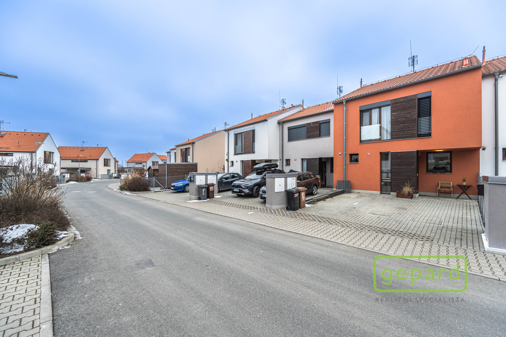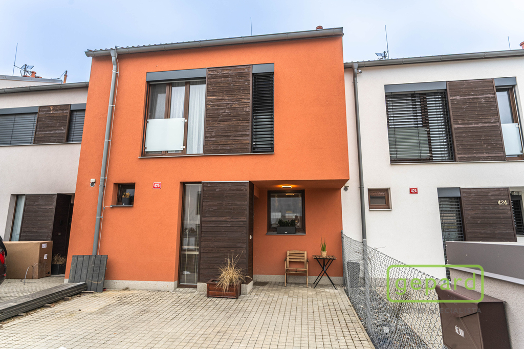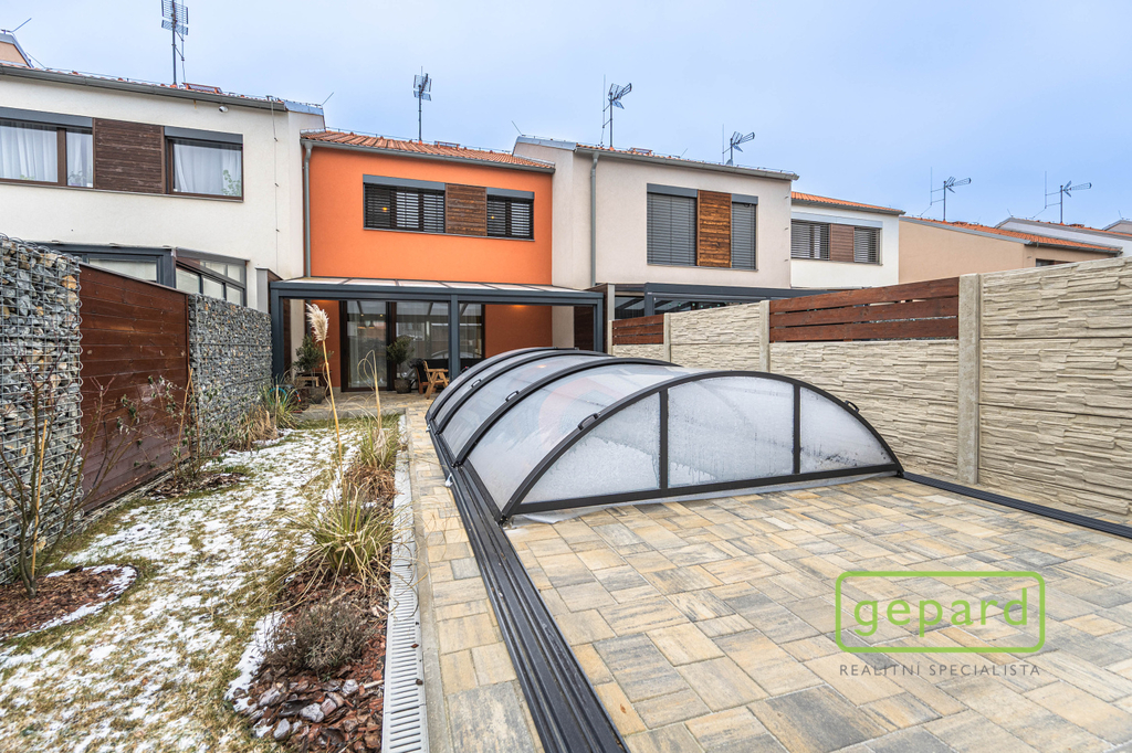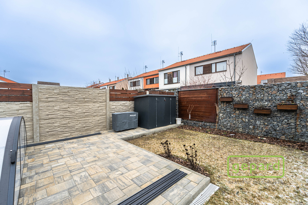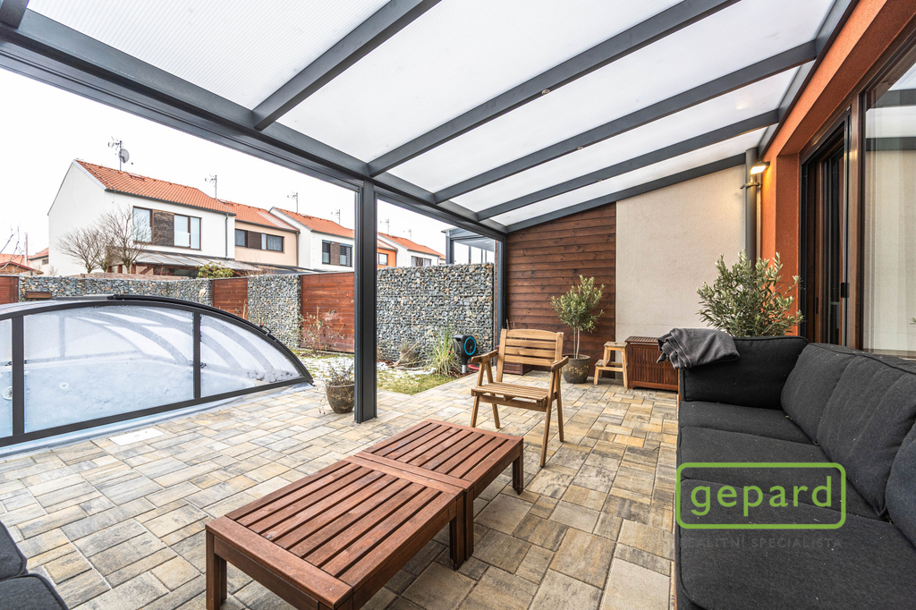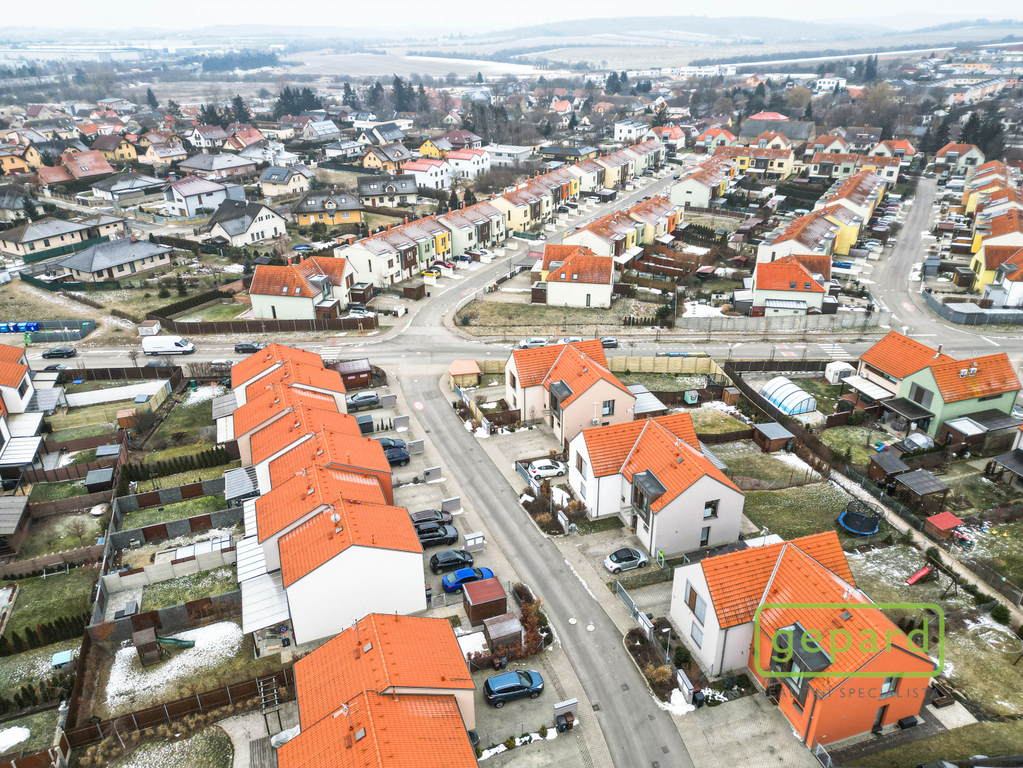 Realitní společnost Gepard nabízí prodej řadového, nadstandardně vybaveného rodinného domu s bazénem. Dvoupodlažní dům o ploše 101,4 m2 a dispozici 4+kk se nachází v klidné části obce Drahelčice, ulice Císařská. Jedná se o dvoupodlažní novostavbu z roku 2019. Celková plocha pozemku činí 199 m2, z toho zastavěná plocha domu činí 64,6 m2, zahrada 94 m2 a prostor na parkování před domem 40,4 m2. V přízemí je chodba (6,4 m2), prostorný obývací pokoj (26,83 m2) s kuchyní (7,16 m2) a se vstupem na zahradu a zastřešenou terasu. Kuchyně je kompletně vybavená spotřebiči (myčka, horkovzdušná trouba, mikrovlnná trouba, indukční varná deska, digestoř, kombinovaná lednice s mrazákem). Dál je v přízemí samostatné WC (2,16 m2), technická místnost (4,1 m2) s místem pro kotel, pračku a sušičku a úložný prostor pod schody (2,82 m2). V patře jsou 3 ložnice (12,74, 10,24 a 9,35 m2), koupelna s vanou i sprchovým koutem (8,75 m2) a šatna (3,36 m2). V podkroví je možné využít další úložný prostor. Před domem je místo pro parkování 2 automobilů. Dům je nabízen částečně zařízený, zůstává zde kuchyňská linka včetně spotřebičů a nábytek na míru dle dohody. Ve všech oknech jsou hliníkové předokenní rolety, v obytných místnostech a na schodišti je dubová dřevěná podlaha. Na zahradě byl v roce 2025 vybudován moderní bazén se zastřešením, slanou vodou, protiproudem, vyhříváním pomocí tepelného čerpadla a automatickou úpravnou vody. Současně byla rekonstruována terasa, je zde hliníková pergola s předním stíněním a podzemní nádrž na dešťovou vodu. Dům je vytápěný plynovým kondenzačním kotlem, je napojený na kanalizaci, vodu, plyn i elektřinu. K dispozici je internet vedený optikou. Dům je volný k nastěhování od 1.6.2026. Obec Drahelčice je vzdálená jen pár minut jízdy od Prahy. Je tak ideálním klidným místem obklopeným přírodou v těsném dosahu velkoměsta. Přímo v obci je mateřská školka i základní škola. Nejbližší obchody a další občanská vybavenost jsou v 3 km vzdálené obci Rudná. Majitel si vyhrazuje právo vybrat zájemce dle jím zvolených kritérií. Doporučujeme prohlídku.