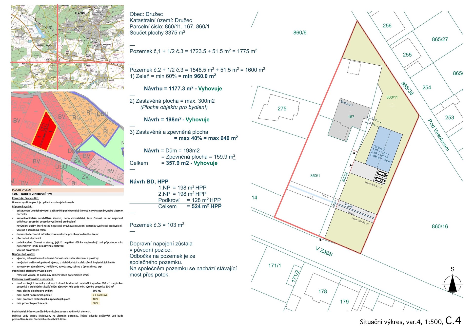 Nabízený stavební pozemek se nachází v centru obce Družec na adrese V Zátiší, okr. Kladno. V případě samostatného prodeje pozemku bude vyhotoven nový geometrický plán, při kterém vznikne samostatný pozemek parc. č. 860/11 o výměře cca 1 600 m². Součástí prodeje je také ideální polovina pozemku parc. č. 860/9, která zajišťuje přístup k nově oddělenému pozemku 860/11. Celková výměra obou pozemků činí 1 600 m². Pozemek lze koupit samostatně nebo společně se sousedním rodinným domem (informace v samostatné inzerci). Jedná o pozemek určený k smíšené výstavbě, možnosti jeho využití jsou opravdu široké. Pozemek je dle územního plánu určen pro venkovské bydlení v rodinných domech, ale je možné jej využít i pro podnikatelské aktivity, jako jsou nevýrobní služby nebo parkování vozidel obyvatel a zákazníků. • Rozsáhlý prostor nabízí možnost realizace velkorysého projektu na ploše 1 600 m² • Flexibilní využití – pozemek lze využít pro výstavbu až dvou rodinných domů, což zvyšuje jeho potenciál. Konkrétní zastavitelnost je však nutné konzultovat se stavebním úřadem. • Možnost propojení s podnikáním – ideální pro ty, kteří chtějí skloubit bydlení a práci. • Jedinečná příležitost ke společné koupi se sousedním rodinným domem, což otevírá další možnosti využití. • Rovinatý pozemek, mírně svažitý v severní části • Orientace: sever – jih • Bez právních vad • Sousední pozemky jsou již zastavěné • Zajištěný přístup přes ideální polovinu pozemku parc. č. 860/9 Voda, kanalizace a elektřina jsou dostupné u sousedního pozemku parc. č. 860/1, což umožňuje snadné a rychlé napojení při výstavbě. • Minimální výměra pozemku: 800 m² • Maximální zastavěná plocha: 300 m² • Povolená výstavba: 2 podlaží + podkroví • Zastavěnost pozemku: max. 40 % • Plochy zeleně: min. 60 % • Široké přípustné využití: územní plán na vyžádání zašleme. Obec Družec leží na okraji Křivoklátské vrchoviny a nabízí bohatou občanskou vybavenost, včetně mateřské a základní školy, obchodu (COOP), dětského a fotbalového hřiště, pošty a obecního úřadu. • Silniční doprava – dálnice D6 (exit Velká Dobrá) je vzdálena jen 3 km. • Autobusová doprava – obec má 5 autobusových zastávek s pravidelnými linkami spojujícími Družec s Kladnem, Prahou a dalšími obcemi (linka 386 Kladno – Praha Zličín, linka 629 Kladno – Družec). • Železniční doprava – v Kamenných Žehrovicích (4,5 km) vede trať na Rakovník a Prahu. • Nový geometrický plán proběhne při podpisu rezervační smlouvy • Územní plán k dispozici na vyžádání • Možnost financování hypotékou – pomůžeme s jejím sjednáním • Pozemek bez právních vad Pro více informací, zaslání územního plánu, geodetického zaměření nebo sjednání osobní prohlídky nás neváhejte kontaktovat. Rádi vám zodpovíme všechny dotazy a pomůžeme s realizací vašeho stavebního projektu.