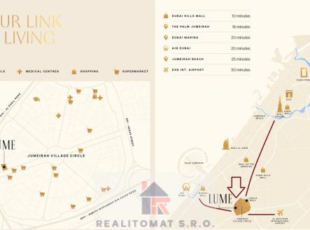 Jako jediní specialisti na Dubajský trh Vám proplatíme letenky do 50 000 kč a osobně Vám ukážeme lokality výstavby projektů, které chcete koupit. Nabízíme prakticky všechny projekty v Dubaji, kde skládáte peníze na vládní účet = bezpečnost investice. Naše realitní kancelář spolupracuje přímo s developery kde sami investujeme, proto se na nás můžete spolehnout a koupit nemovitost, která bude podle Vašich požadavků a následně se postaráme o její následný pronájem tak, aby Vám chodily peníze na Váš český účet. Přebereme byt od developera, provedeme inspekci nemovitosti, vybavíme a následně budeme byt pronajímat. Ať už chcete nemovitost u moře, v centru nebo s návratností okolo 9 % z nájmu, vždy Vám podle Vašich požadavků pomůžeme vybrat tu správnou lokalitu. Zavolejte nám, pokud investujete v Dubaji poprvé a vše si vysvětlíme. Také navštivte naše webové stránky pro více informací v sekci nemovitosti - Dubaj. ☆☆☆☆☆ LUME Residences – Světlo, styl a investiční jistota v srdci Dubaje. Představujeme vám LUME, nový prémiový rezidenční projekt v srdci prestižní čtvrti Jumeirah Village Circle (JVC) – ideální volbu pro moderní život i chytrou investici. Tento projekt spojuje promyšlenou architekturu, nadčasový interiér a strategickou polohu, která zajišťuje výbornou dostupnost do všech klíčových částí Dubaje. Stanice metra je v plánu, takže se ještě více zvýší cena tohoto projektu. Za projektem stojí renomovaný developer S&S Developments, známý svými úspěšnými rezidenčními projekty jako The White Palace či Meydan Residences, ve spolupráci s českou realitní kanceláří Realitomat, která propojuje investory, developery a koncové uživatele v městě budoucnosti. Důraz na kvalitu provedení, dlouhodobou hodnotu a praktické využití prostoru dělá z LUME jednu z nejzajímavějších novinek na trhu. Proč právě LUME? Každý byt je navržen tak, aby spojoval pohodlí, světlo a funkčnost. Interiéry využívají kombinaci světlých tónů, kartáčovaného zlata a elegantních detailů v odstínech terakoty a vínové. Součástí vybavení jsou podlahy z kvalitního laminovaného dřeva, vestavěný nábytek, moderní kuchyňské linky a okna od podlahy ke stropu, která propojují interiér s okolím a zajišťují dostatek přirozeného světla. Vybavení areálu: bazén a venkovní fitness tenisový kurt club house a lounge zóny grilovací a odpočinkové prostory prostor pro komunitní akce Lokalita a dostupnost: Projekt se nachází mezi hlavními tahy E311 (Sheikh Mohammed Bin Zayed Road) a E44 (Al Khail Road), s přímým napojením na Hessa Street. Vše důležité máte na dosah: Dubai Hills Mall – 10 min Dubai Marina – 20 min Palm Jumeirah – 18 min DXB letiště – 30 min Investiční příležitost: Ceny bytů začínají již od 3 700 000 Kč a to s možností splátkového kalendáře 60% během výstavby a 40% po dokončení bez nutnosti okamžitého financování. Byty 2kk od 6 000 000 kč.