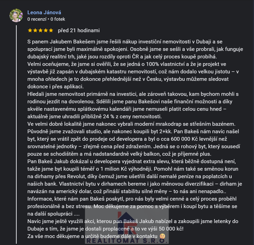 Realitomat je oficiální partner vybraných dubajských developerů a nabízí kompletní investiční poradenství na míru. Na základě vašich požadavků aktivně vyhledáme nejvhodnější investiční příležitosti v Dubaji – ať už hledáte výnos z pronájmu, růst hodnoty nebo kombinaci obojího. Zajistíme celý proces od A do Z: výběr projektu a jednotky převod měny bez poplatků, právní servis. Vyjednání slevy minimálně 3 % z ceny nemovitosti oproti běžné nabídce na trhu. Garance pro klienta: Pokud se nám nepodaří vyjednat slevu, získáte od nás 50 000 Kč na letenky do Dubaje. -- NOVÝ PROJEKT — EXOTICA by Al Marina (JVC, Dubaj) Moderní bydlení obklopené parky v jedné z nejdynamičtějších rodinných komunit Dubaje. Detaily projektu: Developer: Al Marina Investment (více než 13 let na trhu) Budova: Přízemí + 4 podlaží podií + 13 poschodí Celkem jednotek: 88 rezidenčních + 5 obchodních prostor Předání: 4. čtvrtletí 2026 Ceny: ~ 1 ložnicový byt od 1,05 mil. AED (55–116 m²) ~ 2 ložnicový byt od 1,66 mil. AED (106–127 m²) Platební plán: 30/70 Vybavení: Bazén | Fitness | Venkovní kino | Zen zahrada | BBQ zóna | Dětské hřiště | Parní místnosti | Relax lounge | Billiard | 24/7 bezpečnost Investiční výhody: ROI až 9 % - Návratnost investice - v čr zajistíme Dubajskou hypotéku za 5 % = 4% zisk z nemovitosti bez vlastních finančních prostředků + nárůst ceny nemovitosti. Oblast s vysokou poptávkou a plánovanými stanicemi metra Atraktivní vstupní cena pro JVC Ideální pro koncové uživatele i investory ???? Sbíráme EOI (Expressions of Interest) - vratná kauce, lepší a levnější byty v předprodeji. Pro kompletní dostupnost, půdorysy a aktuální nabídky nás kontaktujte přímo.