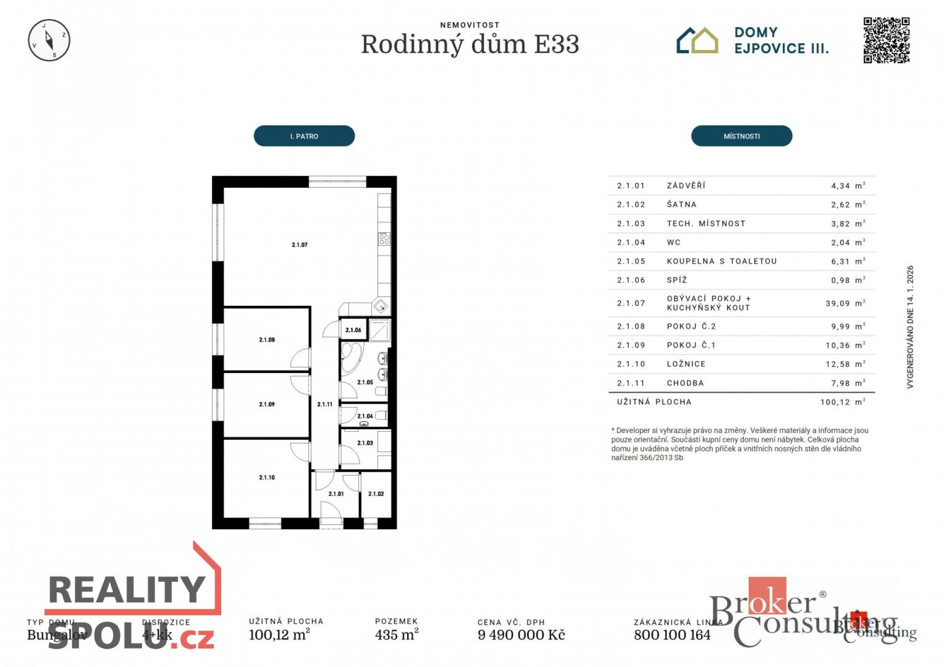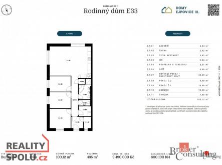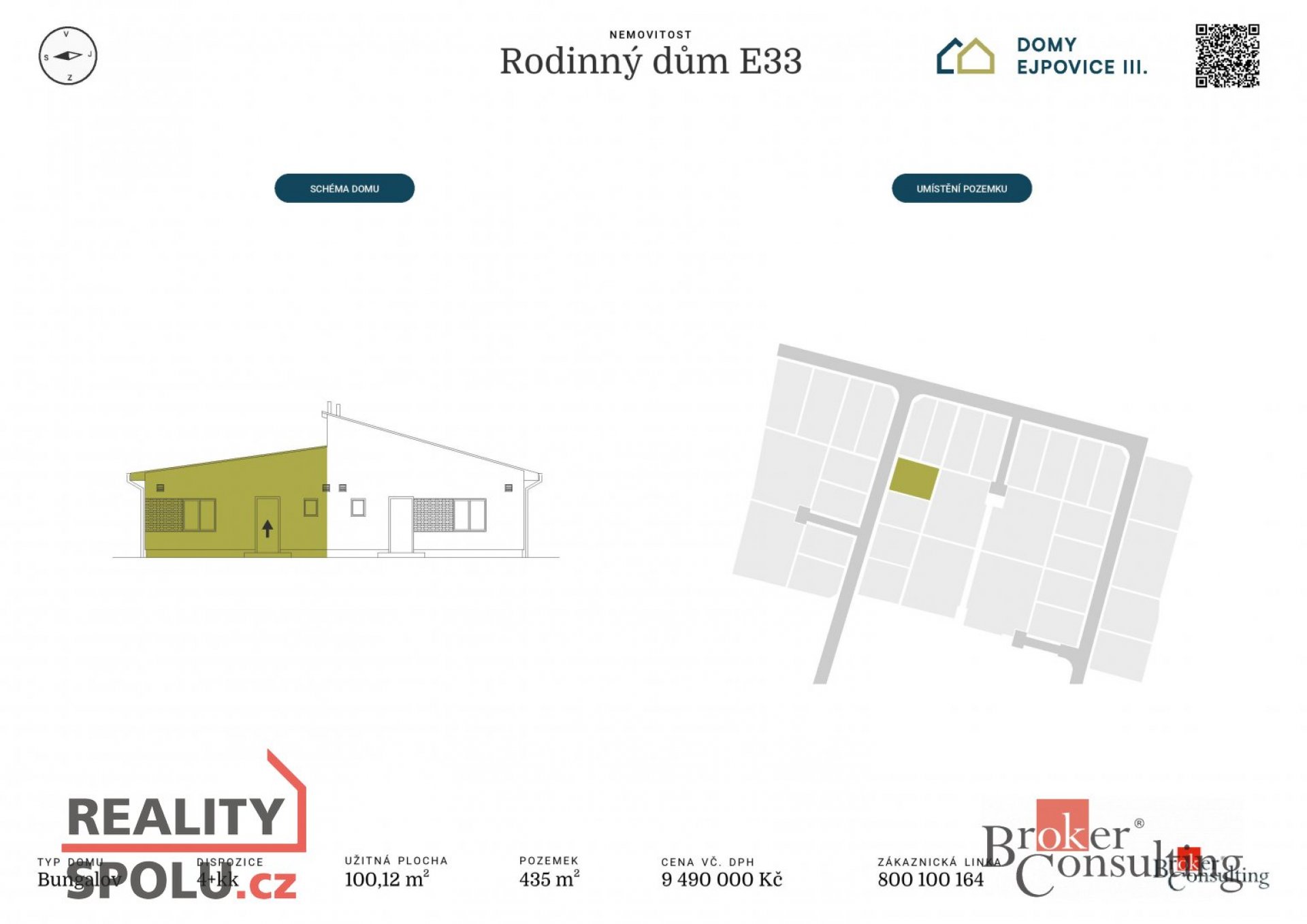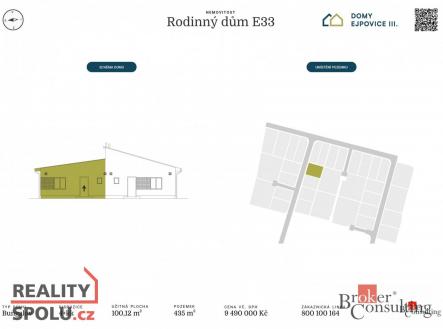 Exkluzivně nabízíme k prodeji rodinný dům o dispozici 4+kk na pozemku o celkové výměře 435 m2 v obci Ejpovice. Přízemní dům o užitné ploše 100,12 m2 představuje nadčasový standard bydlení a to zejména díky použitým materiálům a technologiím. Dům E33 z projektu Domy Ejpovice je členěn v přízemí na vstupní chodbu s šatním prostorem, technickou místnost, koupelnu s vanou i sprchovým koutem a toaletou; samostatné WC, ložnici, dva neprůchozí pokoje, obývací pokoj s kuchyňským koutem a spíž. Obývacímu prostoru dominují francouzská okna se vstupem na zahradu. Architektonicky výrazná novostavba díky své poloze nabídne klidné bydlení, ideální nejen pro rodiny s dětmi. Energetickým úsporám a nízkým nákladům na provoz domu pomohou okna s izolačními trojskly, zateplení obvodových stěn a mnoho dalšího. Aktivní rekuperace Nilan zajistí ohřev vody a vytápění s účinným větráním, chlazením a dotápěním. V ceně domu je také inteligentní ovládání podlahového teplovodního vytápění a předokenních žaluzií chytrou domácností Loxone. Rodinný dům se nachází ve východní části Ejpovic, v blízkosti Ejpovického jezera, přičemž dopravní komunikace je odsud plně zajištěna. Do Plzně se dostanete autem během 10 minut, k Obchodnímu centru Rokycanská během 6 minut a do Rokycan je to pouze 5 minut. Je zde také veškerá občanská vybavenost. Více informací o projektu najdete na webových stránkách projektu Domy Ejpovice. S financováním Vám rádi pomůžeme.