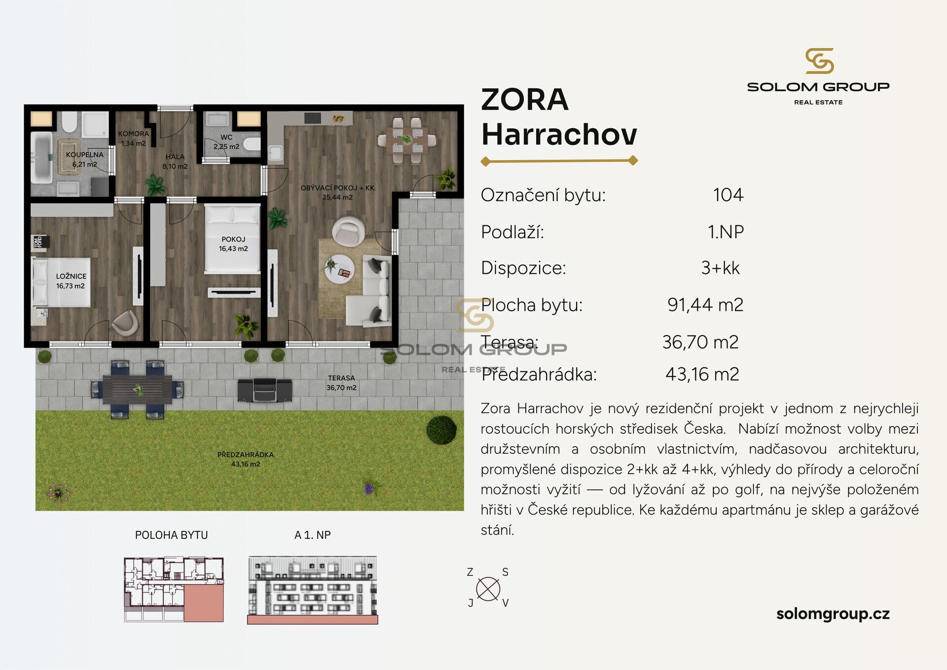 Prodej nového apartmánu 3+kk/, 171,3 m² (byt o výměře 91,44 m² + terasa o výměře 36,70 m² + předzahrádka o výměře 43,16 m²), který se nachází v 1. NP cihlové novostavby v rezidenci ZORA Harrachov, Krkonoše (Dům A) Jelikož se jedná o družstevní apartmán, neprokazujete výši příjmu, nepotřebujete hypoteční úvěr a cenu bytu splácíte formou splátek v měsíčních poplatcích („měsíční splátka anuity“) Splácet začínáte až po kolaudaci domu, do té doby nic neplatíte. Apartmán je Vám předán hotový vč. zařízené koupelny (umyvadlo, vana nebo sprchový kout, topný žebřík a 2x WC) dále interiérové dveře, hliníková okna s izolačními trojskly, nové rozvody vody, elektřiny a odpadů, podlahové vytápění, příprava pro kuchyňskou linku, protipožární vchodové dveře, obklady, příprava pro předokenní žaluzie, vinylové podlahy a dlažba. Vytápění zajištěno vlastní kotelnou v domě. Akontace za apartmán vč. sklepu: 2.987.600,- Kč. Anuita k bytu: 10.496.000,- Kč. Anuita k parkovacímu stání: 448.000,- Kč. Možnost vložení mimořádné splátky či doplacení celé výše anuity a převedení bytu do osobního vlastnictví. Výborná dopravní dostupnost, 5 min. sjezdovka Čertova hora. K apartmánu přísluší terasa o výměře 36,70 m², předzahrádka o výměře 43,16 m², sklep o výměře 2,84 m² a komora o výměře 1,34 m². Parkovací stání možné za příplatek. Harrachov nabízí mnoho vyžití, např. Mumlavské vodopády, Sklárnu Harrachov, skokanské můstky, Pivní lázně nebo Hornické muzeum apod. Lokalita je vhodná jak k vlastnímu bydlení, tak za účelem pronajímání. Předpokládaný termín kolaudace, léto - podzim 2027.