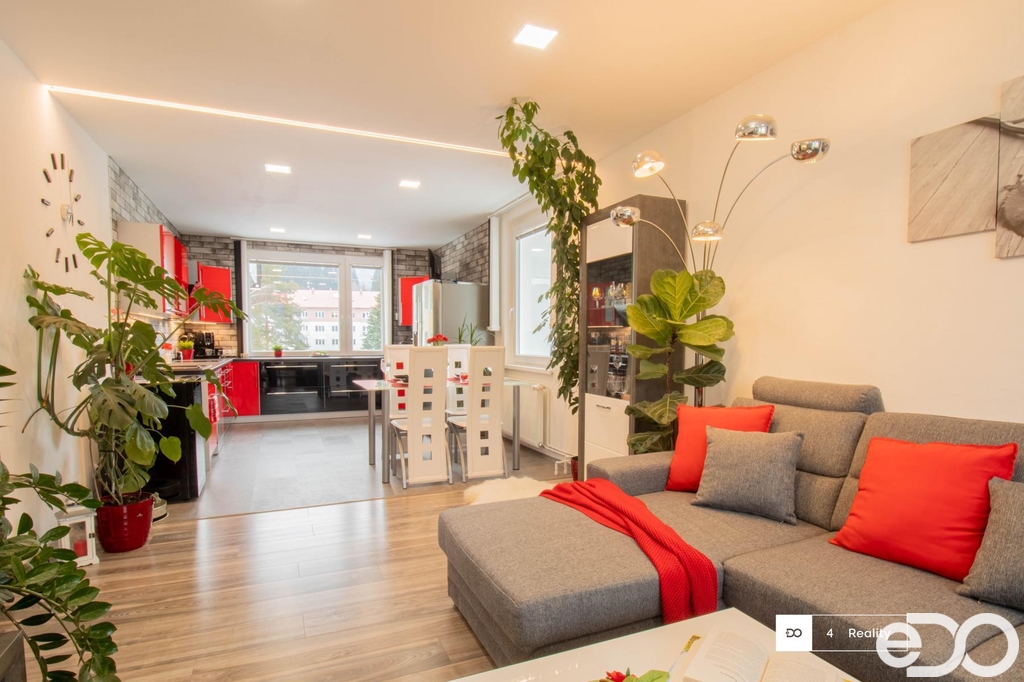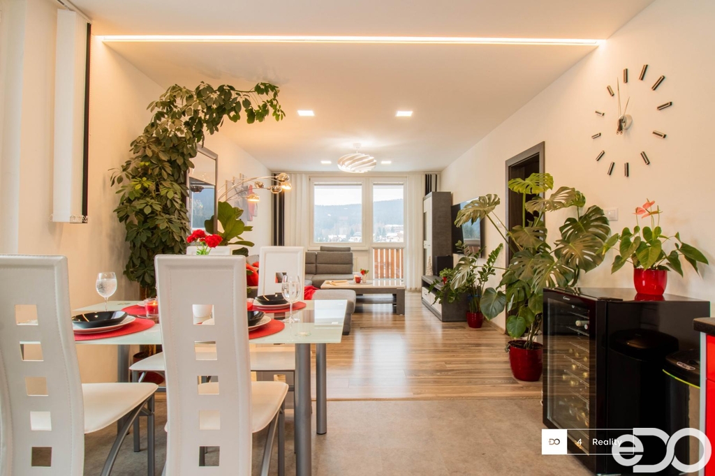 Realitní kancelář eDO Reality Vám exkluzivně nabízí moderní horský apartmán 3+kk o ploše 87,3m2. Součástí je balkón, sklep, je nový výtah a je zde přiřazeno vlastní parkovací místo. Nachází se v části Nový Svět ve čtyřpatrovém bytovém domě, v posledním patře. Apartmán byl výrazně zrekonstruován ve vysoké kvalitě - plastová okna, podlahy, štuky, kompletní rozvody vody a odpadů, 90% elektroinstalace v mědi, změna dispozice na 3+kk, nadstandardní koupelna. Aktuálně se skládá z obývacího pokoje s moderní kuchyní, vestavěnými spotřebiči a lodžií, koupelny s vanou, sprchovým koutem a toaletou, druhé samostatné toalety, prostorné chodby a dvou ložnic. Budova je zateplena, aktuálně se rekonstruuje kotelna, dále parkoviště před domem a k bytu náleží sklepní kóje a úložné prostory na chodbě před bytem. Harrachov je skvělým místem pro milovníky přírody, zábavy a sportu, najdete zde Bobovou dráhu (150m), Lyžarský areál (800m), muzea, restaurace, kavárny, sportovistě, fitness, wellness atd. Příroda zde nabízí výlety na Mumlavské vodopády (3km), Čertovu horu (1km). Je skvělým místem pro rekreaci i bydlení a skvělým výchozím bodem pro výlety na vršky Krkonoš a Jizerek. SVJ v domě funguje velmi dobře, aktuálně se dokončil výtah a rekonstruuje se koupelna, i po těchto investicích je stále ve fondu oprav milion. Byt je aktuálně obydlen a lze předat do 30 dnů od podpisu kupní smlouvy. Doporučuji prohlídku! Pro více info volejte.