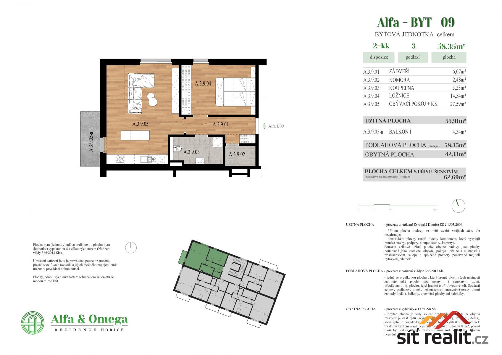 Rezidence Alfa and Omega Hořice přináší moderní, promyšlené a komorní bydlení pro ty, kteří už nechtějí dělat kompromisy. Dva třípodlažní domy v uzavřeném areálu nabídnou pouze 24 bytových jednotek v klidné části Hořic, jen pár minut pěšky od centra i všech důležitých služeb. Každý byt má vlastní venkovní prostor - balkon nebo předzahrádku. Samozřejmostí je výtah, podlahové vytápění s chytrým ovládáním, okna s trojskly, vytápění tepelnými čerpadly, možnost parkování a sklepní kóje. Součástí nabídky je konkrétně byt Alfa B09 o dispozici 2+kk a vnitřní podlahové ploše 58,35 m2, který se nachází ve 3. NP budovy Alfa. K jednotce náleží také balkon o celkové ploše 4,34 m2. Dispozice bytu nabízí prostorný obývací pokoj s kuchyňským koutem, samostatnou ložnicí, předsíň s prostorem pro vestavné skříně, koupelnu s vanou / sprchovým koutem (dle volby klienta) a praktickou komoru. Vysoký standard vybavení je již v základní ceně - na výběr jsou kvalitní obklady a dlažby, značková sanita a v obytných místnostech odolné vinylové podlahy. Dokončení projektu je plánováno na březen 2027. Aktuálně je možné využít zaváděcí ceny a výhodné financování se zálohou pouze 10 % až do kolaudace. Prohlídky jsou možné přímo na stavbě, která je již v plném proudu. Projekt se nachází v tiché slepé ulici Brejníkova, kde máte vše po ruce. Školy, obchody i lékárnu najdete pár minut pěšky, stejně jako náměstí Jiřího z Poděbrad. V okolí oceníte také přírodu, výhledy na Podkrkonoší a klid, který se v každodenním shonu počítá. Výhodou je i nové napojení na dálnici D35, které zlepší spojení s Hradcem Králové i celým regionem, včetně důležitého napojení na Prahu. Pokud preferujete hromadnou dopravu, centrální autobusové nádraží Hořice je pár kroků od domu. Byt je možné financovat hypotékou - kompletně vám zajistíme řešení dle vašich požadavků, včetně porovnání aktuálních podmínek a sazeb u bank. V případě potřeby financování prostřednictvím jiné nemovitosti zajistíme i prodej za zvýhodněných podmínek a smluvně zkoordinujeme financování bytu s developerem. Alfa and Omega znamená bydlení, které vás nebude omezovat, ale přirozeně podpoří ve všem, co od života očekáváte. Moderní architektura, kvalitní materiály a důraz na úspornost vytvářejí místo, kde se dobře bydlí dnes i za desítky let. Pro více informací kontaktujte makléře a domluvte si prohlídku. Více informací naleznete na webových stránkách projektu Rezidence Alfa and Omega Hořice. Ev. č. 2601200019