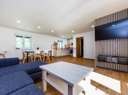 V zastoupení klienta nabízíme k prodeji byt 3kk v kompetně rekonstruované části domu na Horní Bečvě - lokalita Liščí. V domě se nachází dva byty, tento je na pravé straně fotografie (u garáže). Byt má podlahovou plochu 84m2, největším pokojem je obývací pokoj s kuchyňským koutem o výměře 32 m2. V přízemí se ještě nachází koupelna s toaletou. V patře jsou dvě ložnice. K bytu dále náleží sklepní kóje o velikosti 4,,7m2 a terasa 32m2 a malá zahrádka. Také dvě parkovací stání. Mimo podílu na pozemku k tomuto bytu ještě náleží pozemek - zahrádka o výměře 84m a garáž vhodná i pro karavan Byt je vytápěn společným tepelným čerpadlem, odběr bytů je měřen samostatnými měřidly. Vodovod a kanalizace je provozována obcí, každý byt má samostatné měření spotřeby elektřiny. Na podlahách jsou plovoucí podlahy, v koupelně a přdsíni dlažba. Na oknech jsou instalovány venkovní rolety. Dům je zateplen. Bytová jedenotka je vymezena a zapsána na KN, Na domě není žádná zástava ani jiné omezení. V případě zájmu prohlášení vlastníka zašleme zájemcům o byt. V případě rychlého jednání možná sleva. Prohlídky po předchozí dohodě s makléřem