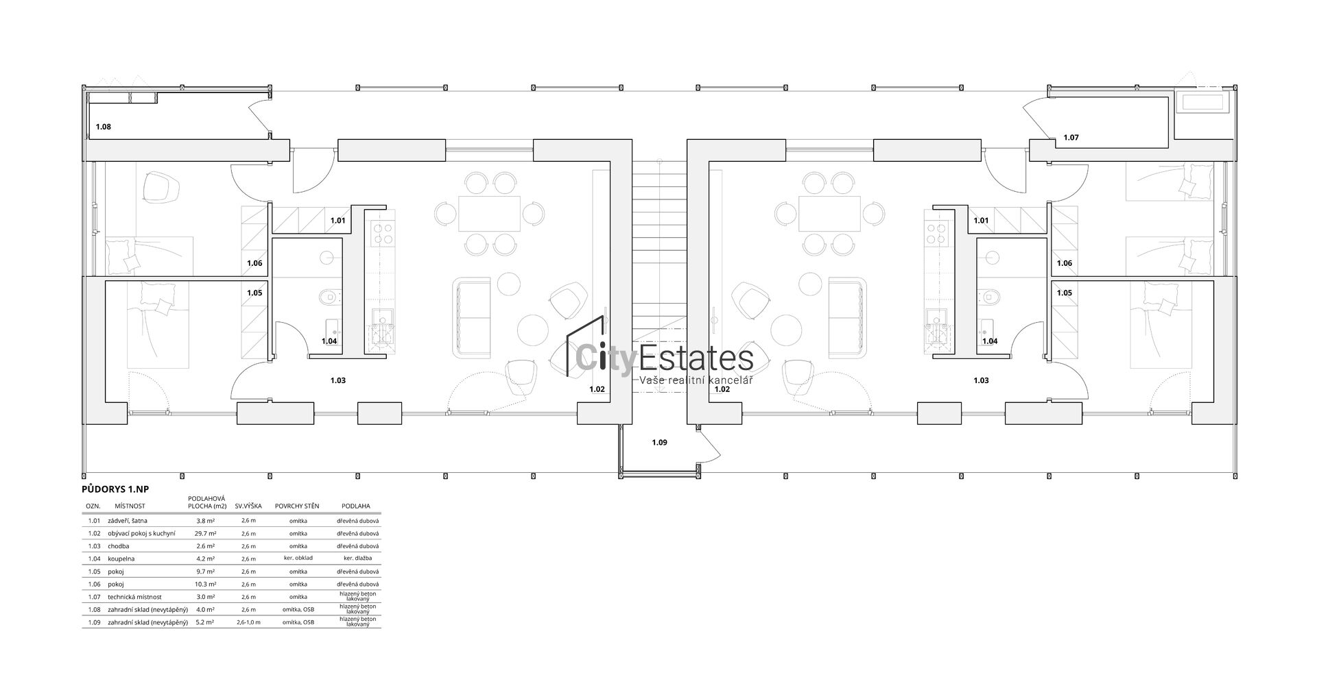 V zastoupení klienta nabízíme v rámci poslední etapy výstavby bytových domů Horní Bečva - Liščí prodej přízemního bytu 3KK s terasou, zahrádkou a parkovacím stáním. Do bytu vstoupíte chodbou, kde je i šatna o velikosti 3,8m. Dále je zde prostorný obývací pokoj s plně vybavenou kuchyní o výměře 29,7m2, dva pokoje 9,7m2, a 10,3m2, koupelna s toaletou 4,2 m2, sklad 5,2m2, terasa 15m2, zahrada 112m2 a parkovací stání. Dům je osazen okny s trojskly, vytápění je zajištěno tepelným čerpadlem - topení je podlahové. Celá lokalita je zasíťována optickým kabelem pro rychlé internetové spojení. Lokalita je nedaleko centra obce, kde naleznete školku, školu, lékaře, obchody a restauraci. Také je zde zastávka autobusu. Projekt získal statut malého developerského projektu u tří bankovních ústavů pro jednoduší vyřízení případné hypotéky. V současné době začala poslední etapa výstavby a s tím i rezervace bytů. První záloha ve výši 20% do deseti dnů od podpisu smlouvy o smlouvě budoucí kupní snížená o rezervační poplatek, 20% po dokončení hrubé stavby, 20% po vydání kolaudačního rozhodnutí a po zapsání jednotek na KN doplatek ve výši 40% a podpis kupní smlouvy. V případě čerpání hypotéky bude splátkový kalendář upraven dle podmínek hypotéčního úvěru. Stavba rychle pokračuje a i silný déšt ukázal, že lokalita je bezpečná. Předpoklad kolaudace říjen 2027. Jedná se o velmi zajímavou lokalitu nedaleko centra obce, blízko cyklostezky.