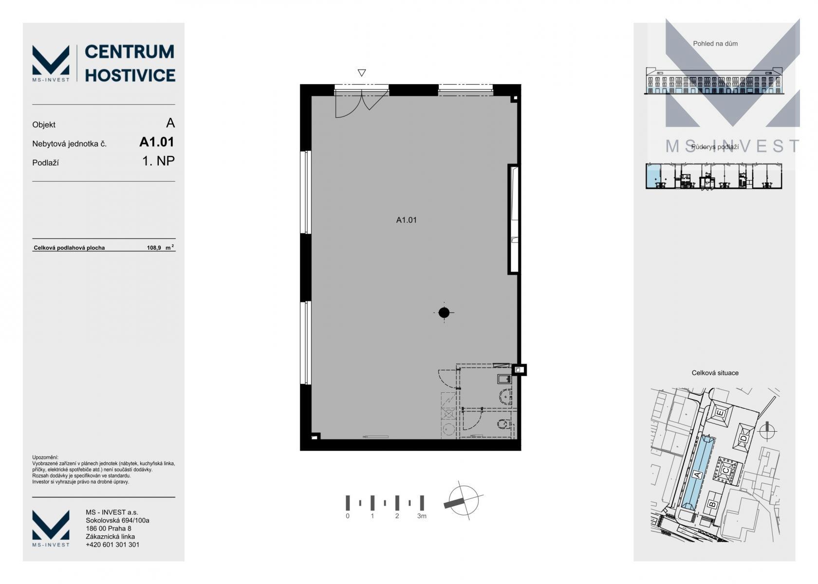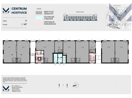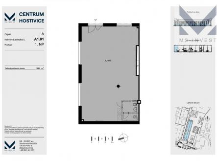 Nabízíme k prodeji komerční jednotku o ploše 109 m2 v přízemí objektu A (č. A 101) se dvěma parkovacími stání v novostavbě projektu Centrum Hostivice. Objekt A, ve kterém se jednotky nacházejí, je umístěn na rohu ulic Čsl. armády a Cihlářská, u autobusové zastávky, při jednom ze vstupů do projektu. Možné využití - obchod, gastro (při splnění podmínek daných předpisy) služby, sídlo finančního ústavu apod. Možné propojení s vedlejší, stejně velkou (110 m2) jednotkou A 102, může tak vzniknout jednotka o velikosti 220 m2. Nebytové prostory budou dokončeny ve stavu shell and core, se všemi nutnými přípojnými body dovedenými na hranici jednotky. Jednotka se prodává jako tzv. rozestavěná jednotka. Kolaudaci si klient řeší sám dle svého konkrétního způsobu využití komerčního prostoru. Nově vznikající projekt Centrum Hostivice se nachází v centru obce Hostivice, v těsné blízkosti Husova náměstí, při hlavní ulici Čsl. Armády, naproti zámku a supermarketu Lidl. V rámci projektu vznikne celkem 5 nových objektů s celkem 86 bytovými jednotkami a dvěma ateliéry. V přízemním parteru všech budov budou nebytové prostory určené pro větší i drobné obchody a služby všeho druhu. V ceně této komerční jednotky jsou dvě venkovní parkovací stání přímo u dané jednotky, je možné přikoupit i garážové stání v podzemním podlaží projektu. Výtah propojuje tento suterén s nadzemními podlažími. Vjezd do suterénu je z ulice Cihlářská. Nabídku dalších nebytových jednotek i bytů naleznete na webových stránkách projektu. Dokončení výstavby objektu A je naplánováno na jaro roku 2026.