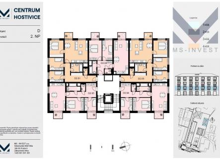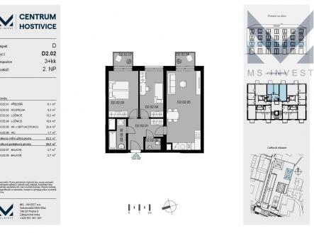 Byt D202 se nachází ve 2. NP budovy D nového projektu Centrum Hostivice. Byt má plochu 69 m2 a je orientován na jihovýchod. Obývací pokoj má 25 m2 a vchází se z něj na první balkon o ploše 3 m2, ložnice má 13 m2 a je u ní druhý balkon, pokoj pak má 11 m2, v koupelně o velikosti 4,5 m2 je vana, WC je zvlášť. Nově vznikající projekt Centrum Hostivice se nachází v centru obce Hostivice, v těsné blízkosti Husova náměstí, při hlavní ulici Čsl. Armády, naproti zámku a supermarketu Lidl. V rámci projektu vznikne celkem 5 nových objektů s celkem 86 bytovými jednotkami a dvěma ateliéry, v přízemním parteru všech budov potom budou nebytové prostory pro drobné obchody a služby všeho druhu. V každé budově bude výtah propojující nadzemní podlaží se suterénem, ve kterém budou umístěny sklepy a garážová stání. Vjezd do suterénu je z ulice Cihlářská. Sklepní kóje je v ceně bytu, ke každému bytu je možné dokoupit garážové stání. Projekt je realizován ve vysokém standardu, mezibytové zdi jsou vždy železobetonové monolitické nebo zděné, v koupelnách jsou použity velkoformátové obklady a dlažby do výšky podhledu. Výstavba projektu byla zahájena demolicí některých stávajících objektů v únoru 2023, termín dokončení stavební firmou je plánován na 6/2025, kolaudace a předávání bytů budou probíhat následně.