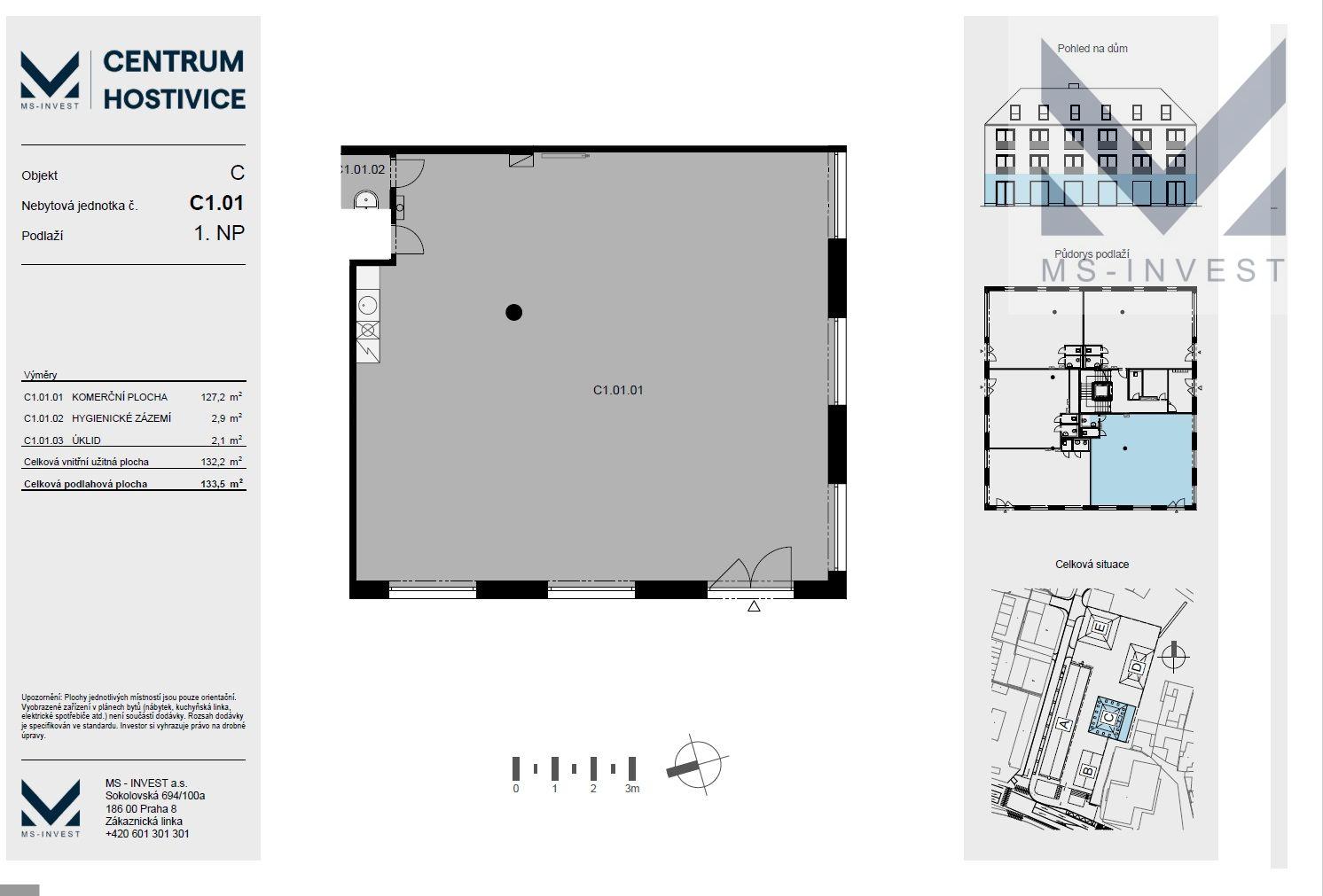 Nabízíme k prodeji komerční prostor s jedním parkovacím stáním s výměrou 103 m2 v přízemí novostavby moderní multifunkční budovy v centru Hostivic. Jednotka D 101 je umístěna v 1. NP (přízemí) budovy D s přímým vstupem z nově vzniklého prostoru mezi budovami, který zároveň bude sloužit jako průchozí místo mezi ulicí Čsl. Armády, ul Cihlářskou a vlakovým nádražím. Prostor je vhodný jako obchod, kanceláře, ordinace apod. Budoucí uživatel si jednotku kolauduje sám podle jím vybraného účelu, prostory se prodávají ve stavu shell and core, jako rozestavěná jednotka. Prodej přímo od developera. Cena je uvedena včetně DPH s jednoho venkovního parkovacího stání. Nově vznikající projekt Centrum Hostivice se nachází v centru obce Hostivice, v těsné blízkosti Husova náměstí, při hlavní ulici Čsl. Armády, naproti zámku a supermarketu Lidl. V rámci projektu vznikne celkem 5 nových objektů s celkem 86 bytovými jednotkami a dvěma ateliéry. . V každé budově bude výtah propojující nadzemní podlaží se suterénem, ve kterém budou umístěny sklepy a garážová stání. Vjezd do suterénu je z ulice Cihlářská. Ke každé jednotce je možné dokoupit i garážové stání. Nabídku dalších bytů i nebytových jednotek naleznete na webu projektu. Tato budova bude dokončena v září tohoto roku.
