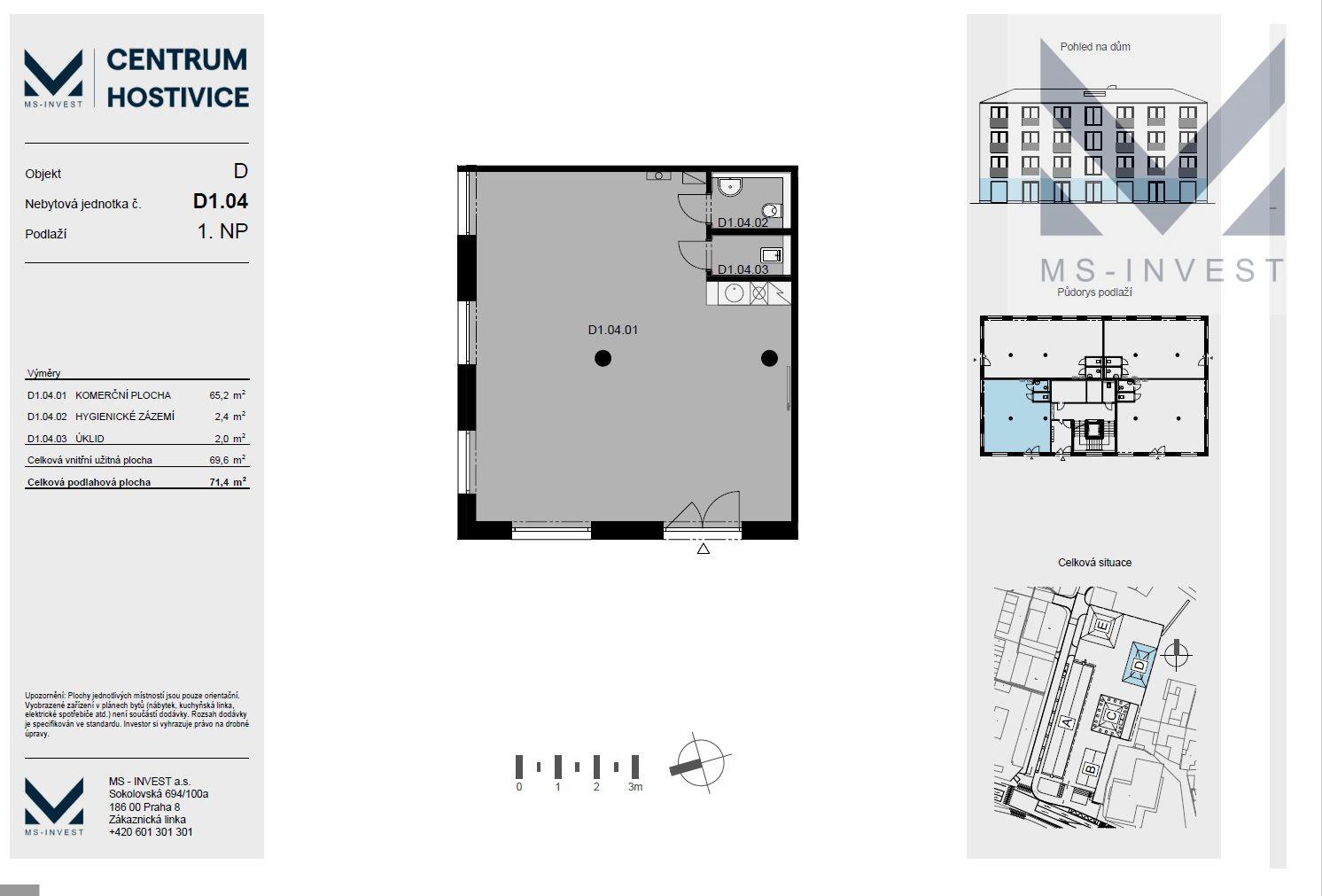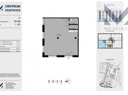 Nabízíme k prodeji komerční prostor s jedním parkovacím stáním s výměrou 71 m2 v přízemí novostavby moderní multifunkční budovy v centru Hostivic. Jednotka D 104 je umístěna v 1. NP (přízemí) budovy D s přímým vstupem z nově vzniklého prostoru mezi budovami, který zároveň bude sloužit jako průchozí místo mezi ulicí Čsl. Armády, ul Cihlářskou a vlakovým nádražím. Prostor je vhodný jako obchod, kanceláře, ordinace apod. Budoucí uživatel si jednotku kolauduje sám podle jím vybraného účelu, prostory se prodávají ve stavu shell and core, jako rozestavěná jednotka. Možnost koupě parkovacích stání před jednotkou. Prodej přímo od developera. Cena je uvedena včetně DPH s jednoho venkovního parkovacího stání. Nově vznikající projekt Centrum Hostivice se nachází v centru obce Hostivice, v těsné blízkosti Husova náměstí, při hlavní ulici Čsl. Armády, naproti zámku a supermarketu Lidl. V rámci projektu vznikne celkem 5 nových objektů s celkem 86 bytovými jednotkami a dvěma ateliéry. . V každé budově bude výtah propojující nadzemní podlaží se suterénem, ve kterém budou umístěny sklepy a garážová stání. Vjezd do suterénu je z ulice Cihlářská. Ke každé jednotce je možné dokoupit i garážové stání. Nabídku dalších bytů i nebytových jednotek naleznete na webu projektu. Tato budova bude dokončena v září tohoto roku.