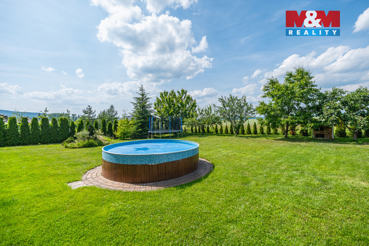 Ve výhradním zastoupení nabízíme krásný dům 5+kk v Hostomicích pod Brdy s plochou 222 m² a pozemkem 1140 m². Dům splňuje vše, co se od rodinného domu očekává. Doménou prvního podlaží je obývací pokoj s jídelnou a kuchyní s velkorysou plochou 44,5 m², dále se zde nachází zádveří, chodba, koupelna se sprchovým koutem, samostatné WC a technická místnost ze které je vstup na zahradu. Druhé podlaží nabízí dvě ložnice, dva dětské pokoje, koupelnu s rohovou vanou, samostatné WC a chodbu. Stahovacími schody se dá vyjít na půdu, která je průchozí v celé délce domu. Obě koupelny mají vyhřívané podlahy. Dům byl stavěn s velikým důrazem na kvalitu a nabízí příkladnou dispozici, které nelze při této ceně nic vytknout. Součástí je také velká garáž, útulná terasa na posezení a velká udržovaní zahrada s bazénem. Zveme Vás na prohlídku vašeho nového domova!