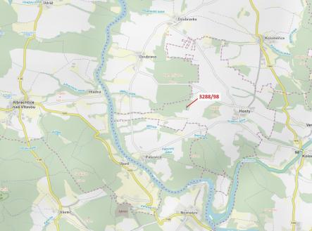 Lesní pozemek o výměře 1685 m2, parcelní číslo 3288/98, podíl 1/1, katastrální území Hosty, obec Hosty, obec s rozšířenou působností Týn nad Vltavou, okres České Budějovice, Jihočeský kraj. Po těžbě.